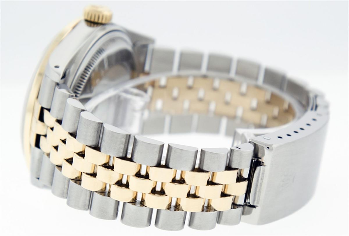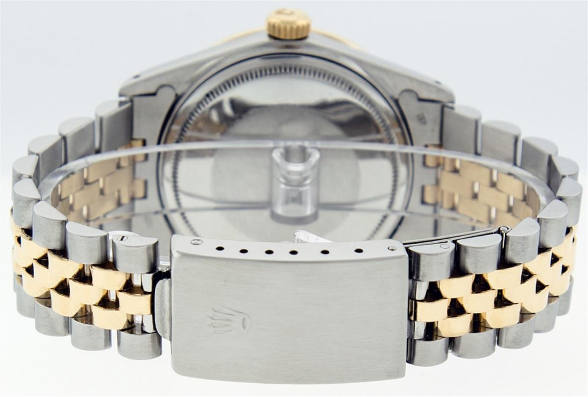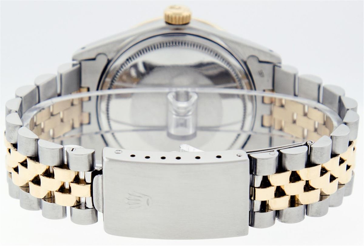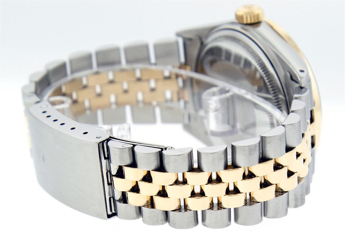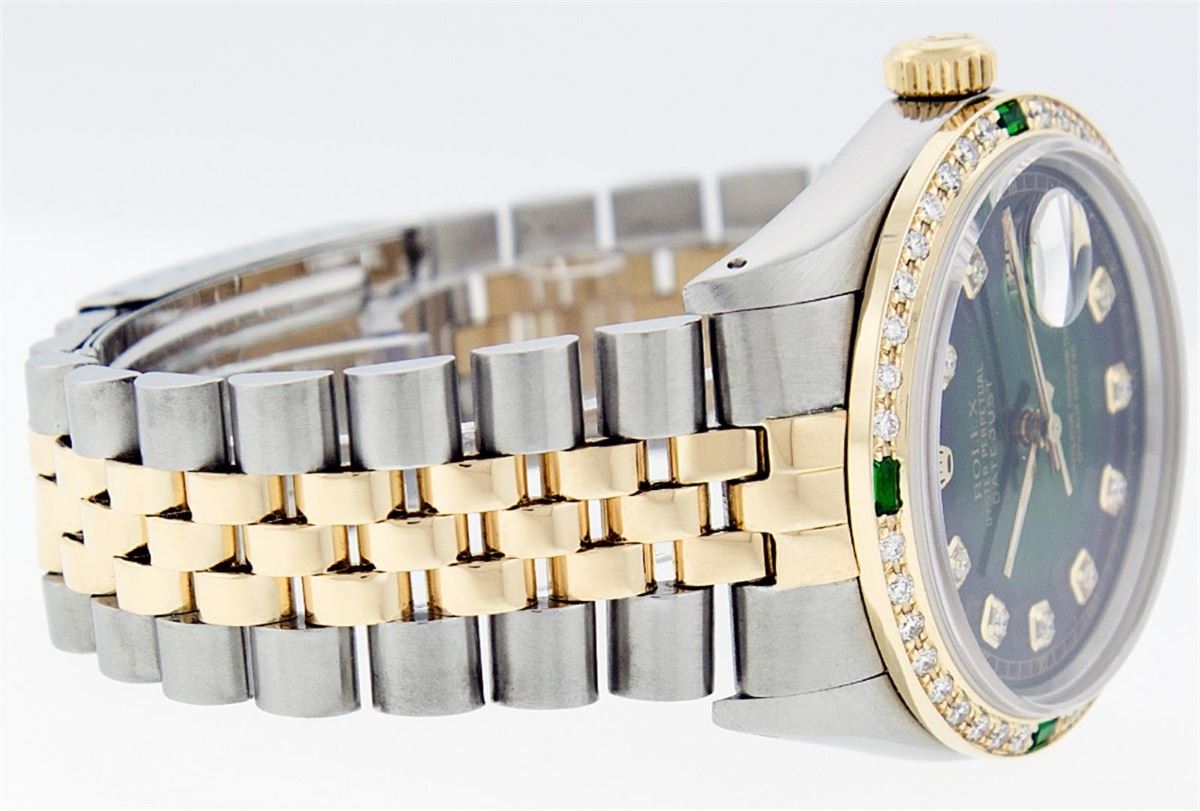 One Gents Two Tone Rolex Datejust Polished, Serviced & Electronically Tested, 18K Yellow Gold & Stainless Steel Case:36mm, 18K Yellow Gold Crown, Custom Bezel: 18K Yellow Gold Emerald Beadset Diamond Bezel, Diamond Count: 36 Diamonds + 4 Emeralds, Total Weight 1.00 Carat, Clarity: Si-VS, Color: G to H. Crystal: Synthetic Sapphire Cyclops Lens. Movement: Automatic Winding Movement Caliber 3135. Custom Dial: Green Vignette With Diamond Hour Markers & Square Roman Track. Diamond Count: 10 Diamonds Clarity: SI-VS, Color: Color G to H Date Window: 3 O'clock Position Date Display, Quickset, Model: 16233 Condition: G-6 Extra Fine. Bracelet: Two Tone 18K Yellow Gold & Stainless Steel Jubilee. Bright Polish. 6.5 Inch Length, Adjustable. Standard Clasp, With Rolex Logo.