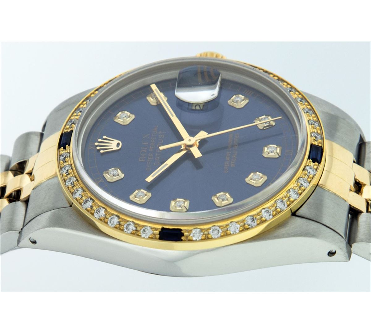 One Gents Two Tone Rolex Datejust Polished, Serviced & Electronically Tested, 18K Yellow Gold & Stainless Steel Case:36mm, 18K Yellow Gold Crown, Custom Bezel: 18K Yellow Gold Sapphire Beadset Diamond Bezel, Diamond Count: 36 Diamonds + 4 Sapphires Total Weight 1.00 Carat, Clarity: Si-VS, Color: G to H. Custom Crystal: Synthetic Sapphire Cyclops Lens. Movement: Automatic Winding Movement Caliber 3135. Custom Dial: Blue Dial Set With Diamond Hour Markers & Square Roman Track, Diamond Count: 10 Diamonds in Dial G To H In Color, Si-VS Clarity, Date Window: 3 O'clock Position Date Display, Quickset, Model: 16233 Condition: G-6 Extra Fine. Bracelet: Two Tone 18K Yellow Gold & Stainless Steel Jubilee. Bright Polish. 6.5 Inch Length, Adjustable. Standard Clasp, With Rolex Logo.