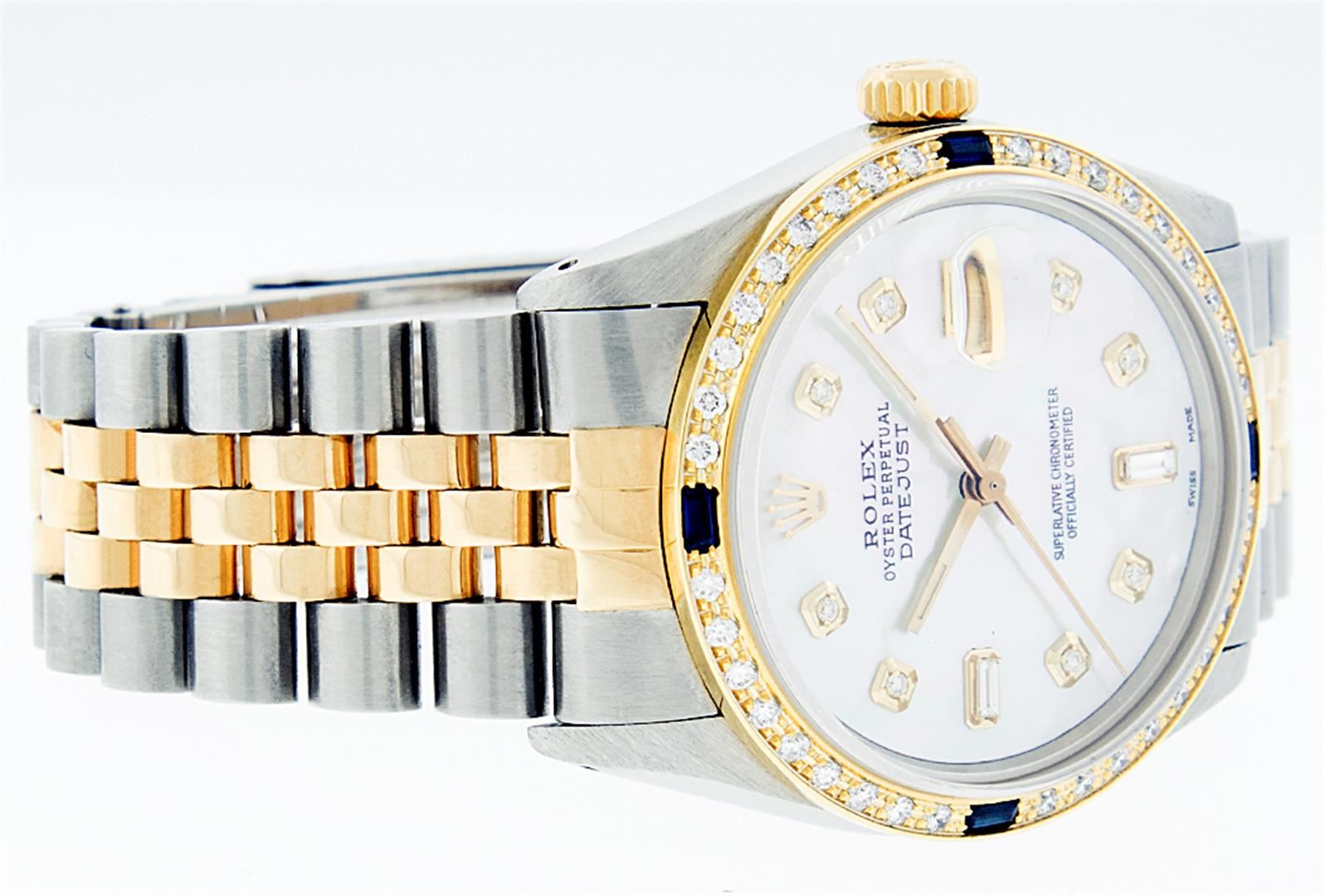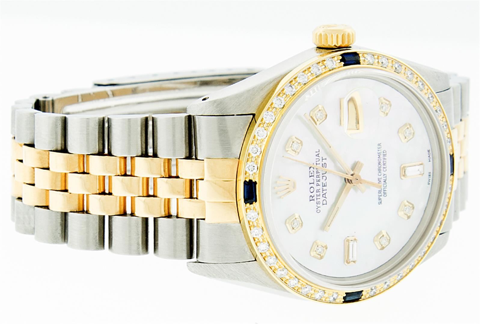 One Gents Two Tone Rolex Datejust Polished, Serviced & Electronically Tested, 18K Yellow Gold & Stainless Steel Case:36mm, 18K Yellow Gold Crown, Custom Bezel: 18K Yellow Gold Sapphire Beadset Diamond Bezel, Diamond Count: 36 Diamonds + 4 Sapphires Total Weight 1.00 Carat, Clarity: Si-VS, Color: G to H. Crystal: Synthetic Sapphire Cyclops Lens. Movement: Automatic Winding Movement Caliber 3135. Custom Dial: Mother Of Pearl Dial Set With Diamond Hour Markers and Baguette Hour Markers On 6 and 9, Diamond Count: 8 + 2 Baguette Diamonds in Dial G To H In Color , Date Window: 3 O'clock Position Date Display, Quickset, Model: 16233 Condition: G-6 Extra Fine. Bracelet: Two Tone 18K Yellow Gold & Stainless Steel Jubilee. Bright Polish. 6.5 Inch Length, Adjustable. Standard Clasp, With Rolex Logo.