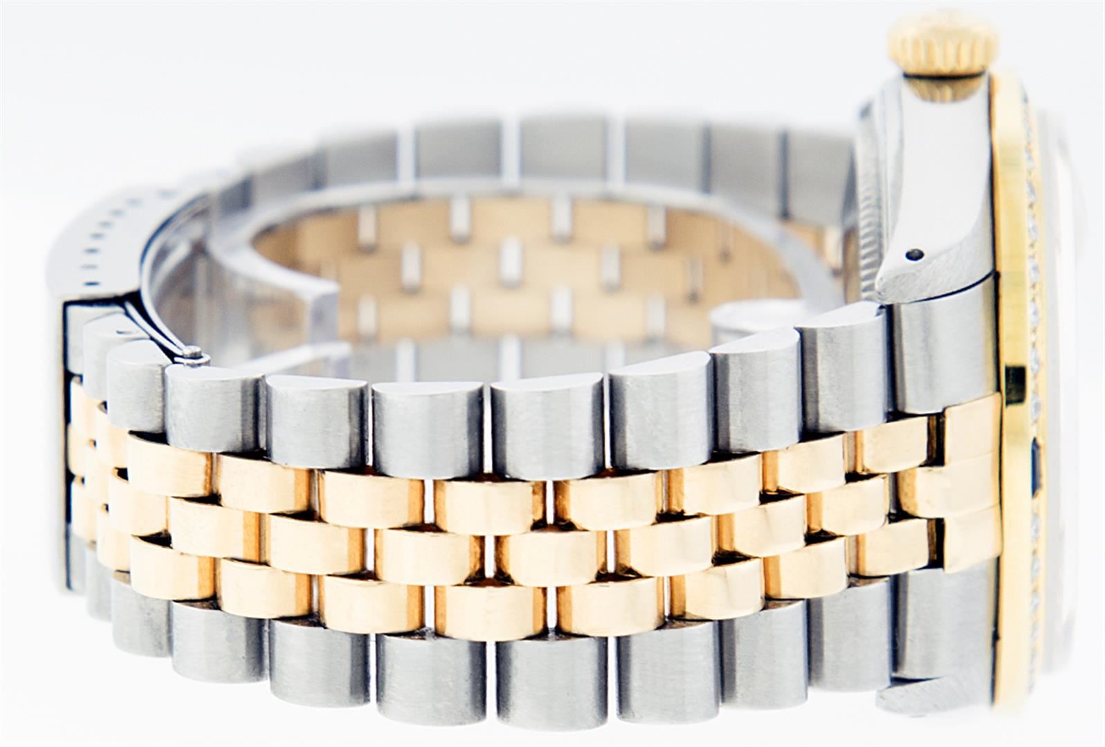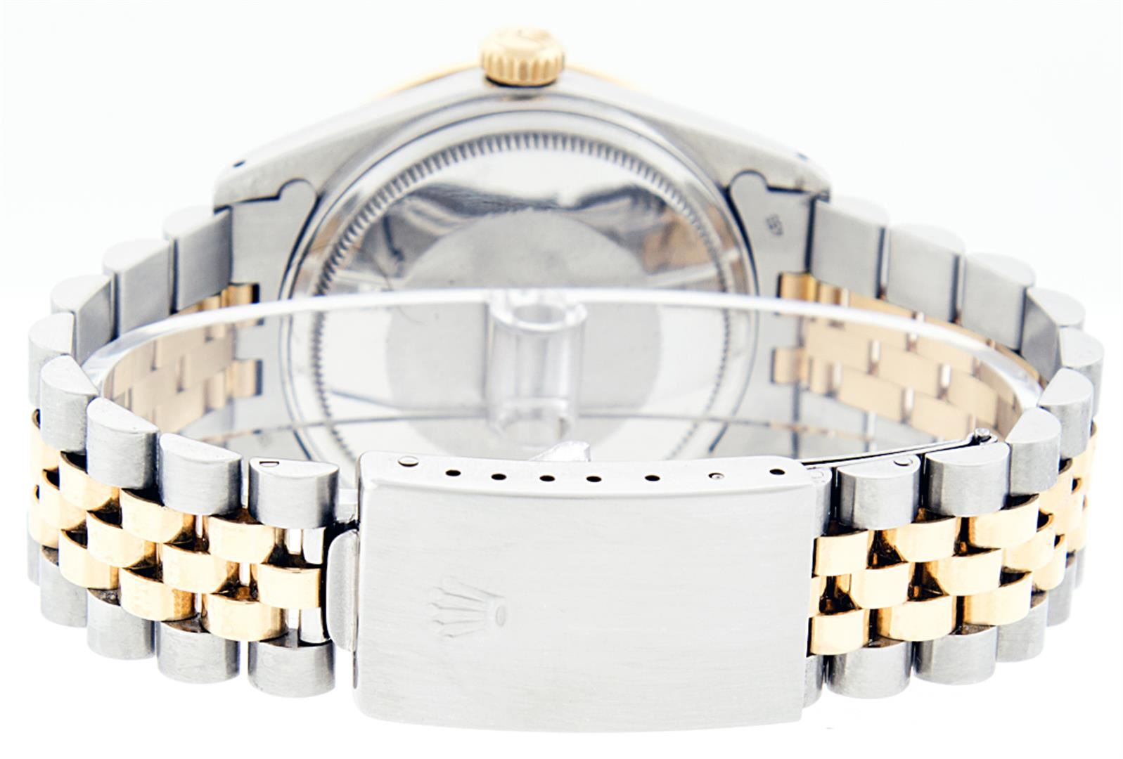 One Gents Two Tone Rolex Datejust Polished, Serviced & Electronically Tested, 18K Yellow Gold & Stainless Steel Case:36mm, 18K Yellow Gold Crown, Custom Bezel: 18K Yellow Gold Sapphire Beadset Diamond Bezel, Diamond Count: 36 Diamonds + 4 Sapphires Total Weight 1.00 Carat, Clarity: Si-VS, Color: G to H. Crystal: Synthetic Sapphire Cyclops Lens. Movement: Automatic Winding Movement Caliber 3135. Custom Dial: Mother Of Pearl Dial Set With Diamond Hour Markers and Baguette Hour Markers On 6 and 9, Diamond Count: 8 + 2 Baguette Diamonds in Dial G To H In Color , Date Window: 3 O'clock Position Date Display, Quickset, Model: 16233 Condition: G-6 Extra Fine. Bracelet: Two Tone 18K Yellow Gold & Stainless Steel Jubilee. Bright Polish. 6.5 Inch Length, Adjustable. Standard Clasp, With Rolex Logo.