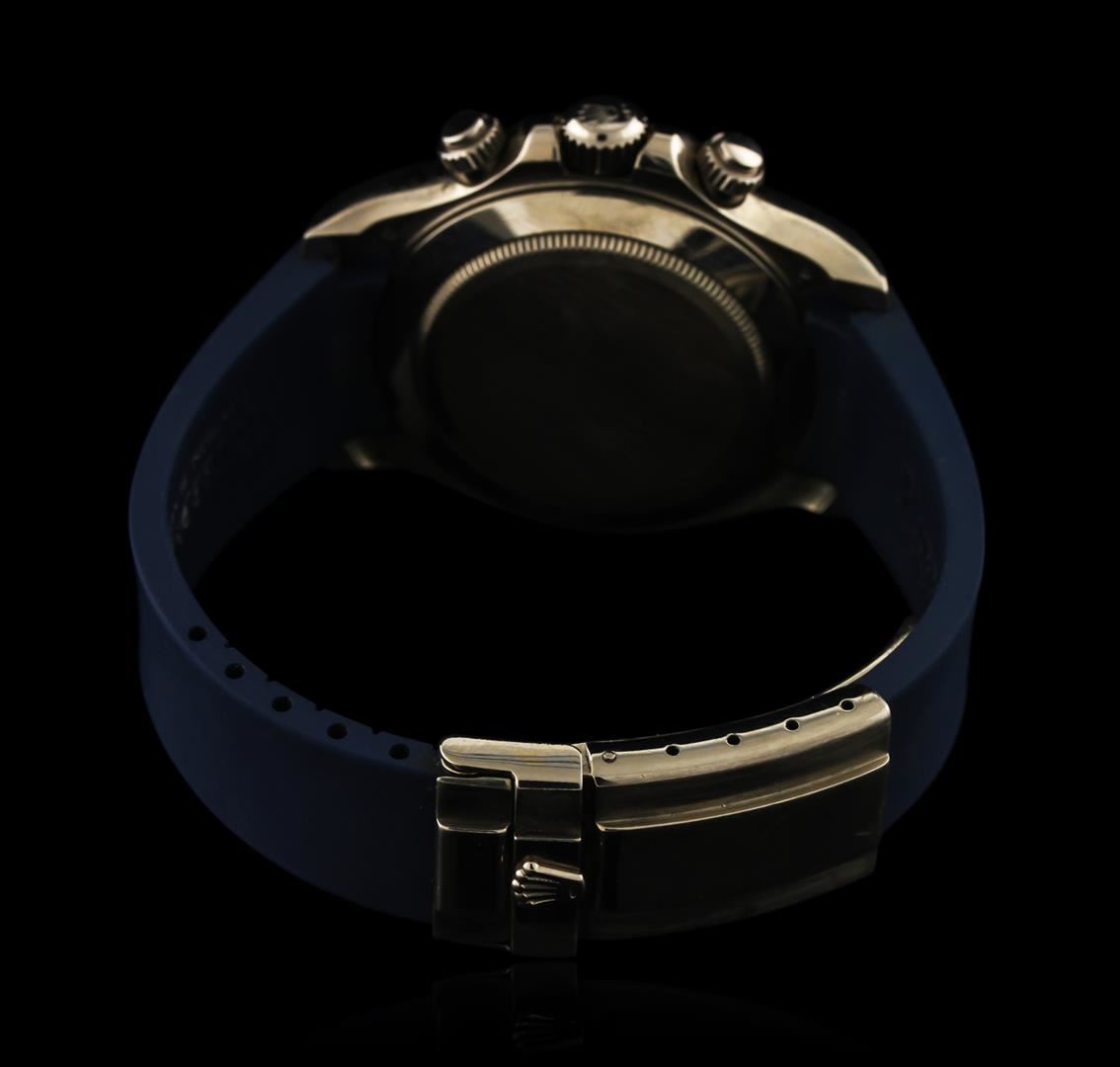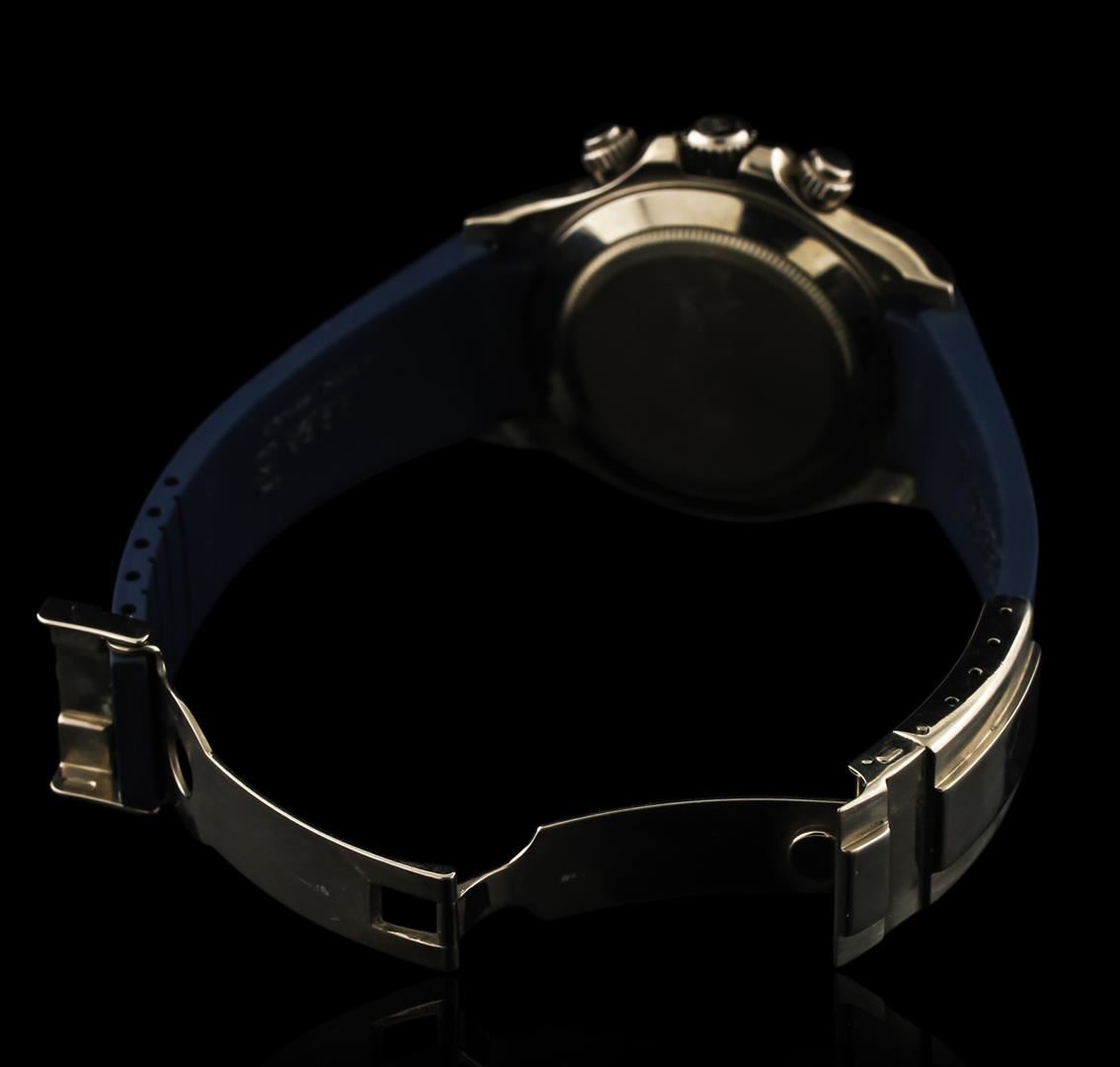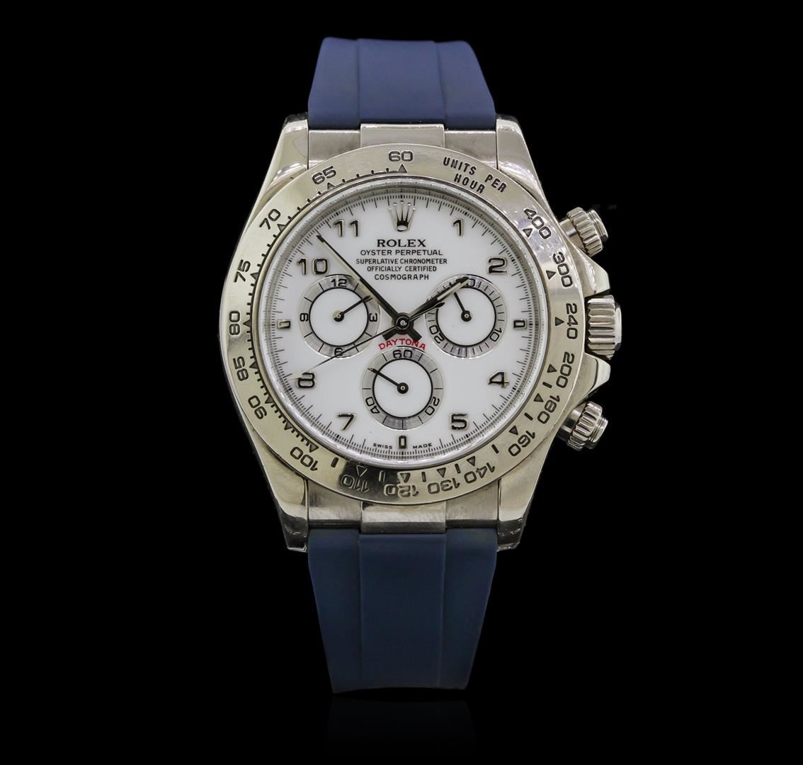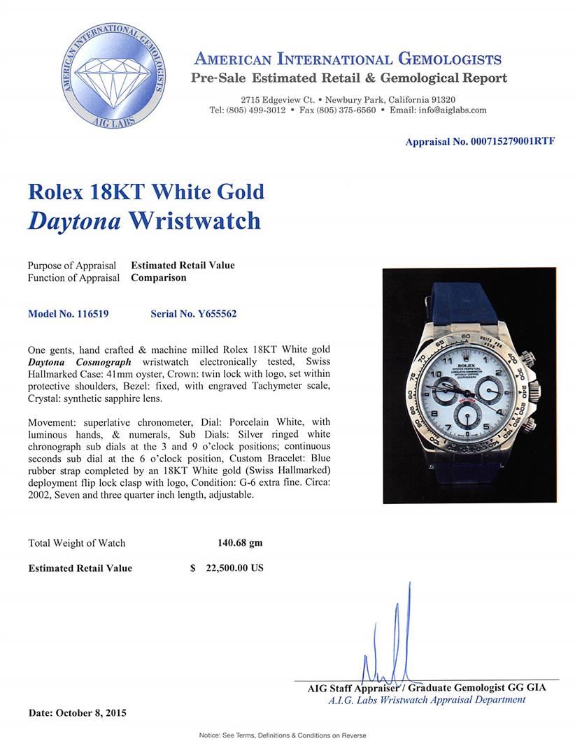 One gents, hand crafted & machine milled Rolex 18KT White gold Daytona Cosmograph wristwatch electronically tested, Swiss Hallmarked Case: 41mm oyster, Crown: twin lock with logo, set within protective shoulders, Bezel: fixed, with engraved Tachymeter scale, Crystal: synthetic sapphire lens. Movement: superlative chronometer, Dial: Porcelain White, with luminous hands, & numerals, Sub Dials: Silver ringed white chronograph sub dials at the 3 and 9 o'clock positions; continuous seconds sub dial at the 6 o'clock position, Custom Bracelet: Blue rubber strap completed by an 18KT White gold (Swiss Hallmarked) deployment flip lock clasp with logo, Condition: G-6 extra fine. Circa: 2002, Seven and three quarter inch length, adjustable. Total Weight of Watch 140.68gm. Comes with papers. AIG Appraised at $22,500.00.