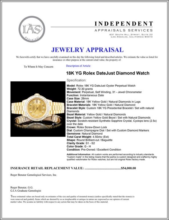 Model: Rolex 18K YG DateJust Oyster Perpetual Watch