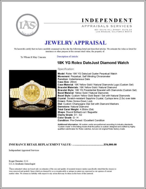 Model: Rolex 18K YG DateJust Oyster Perpetual Watch
