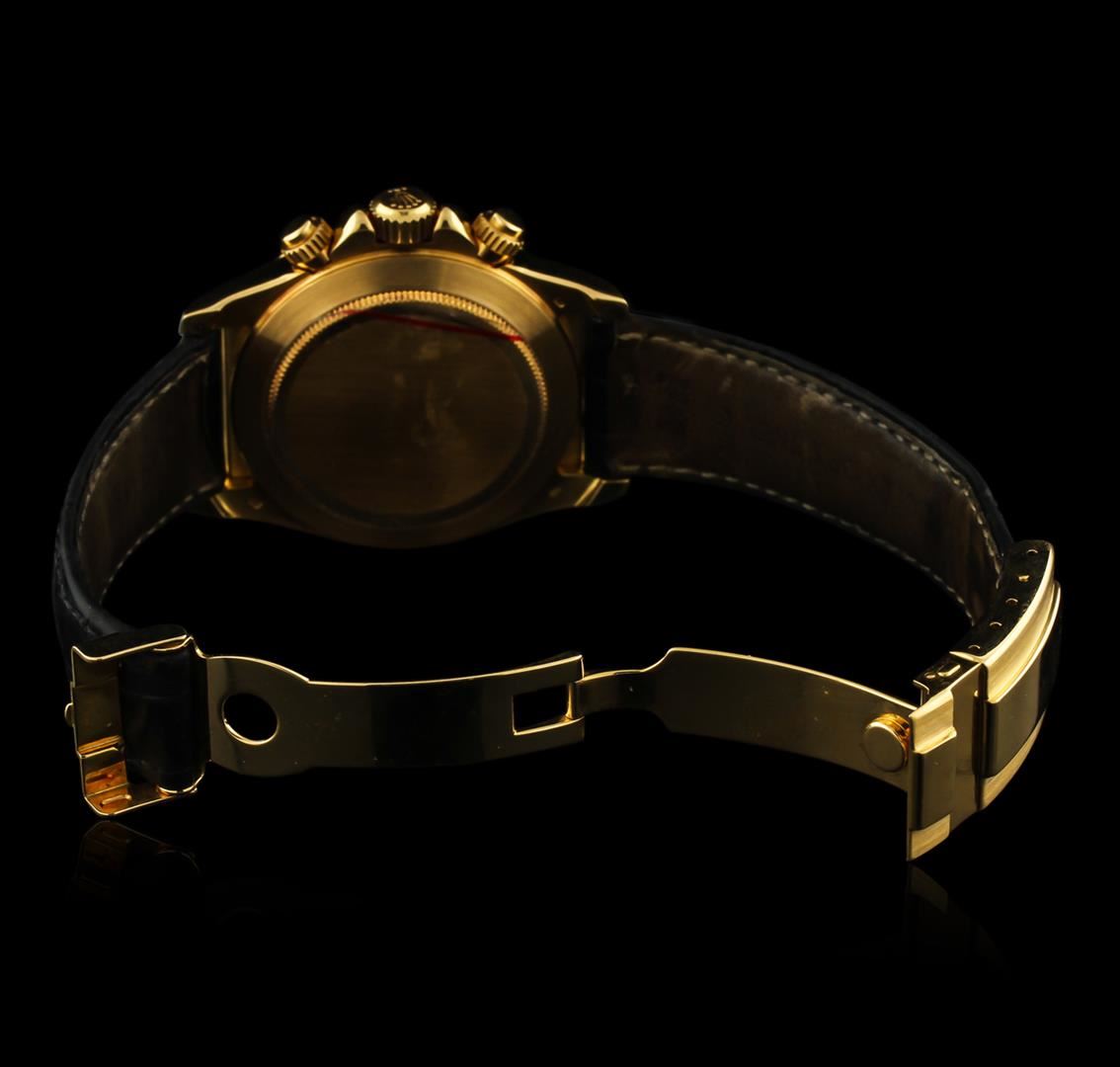 One gents, hand crafted & machine milled Rolex 18KT Yellow gold Daytona Cosmograph wristwatch electronically tested, Swiss Hallmarked Case: 40mm oyster, Crown: twin lock with logo, set within protective shoulders, Bezel: fixed, with engraved Tachymeter scale, Crystal: synthetic sapphire lens. Movement: superlative chronometer, Dial: Porcelain White, with baton hands, & numerals, Sub Dials: Black ringed white chronograph sub dials at the 3 and 9 o'clock positions; continuous seconds sub dial at the 6 o'clock position, Bracelet: Black saddle stitched leather strap completed by an 18KT Yellow gold (Swiss Hallmarked) deployment flip lock clasp with logo, Condition: G-6 extra fine. Circa: 1992, Seven and one half inch length, adjustable. Total Weight of Watch140.68gm. AIG Appraised at $22,000.00.