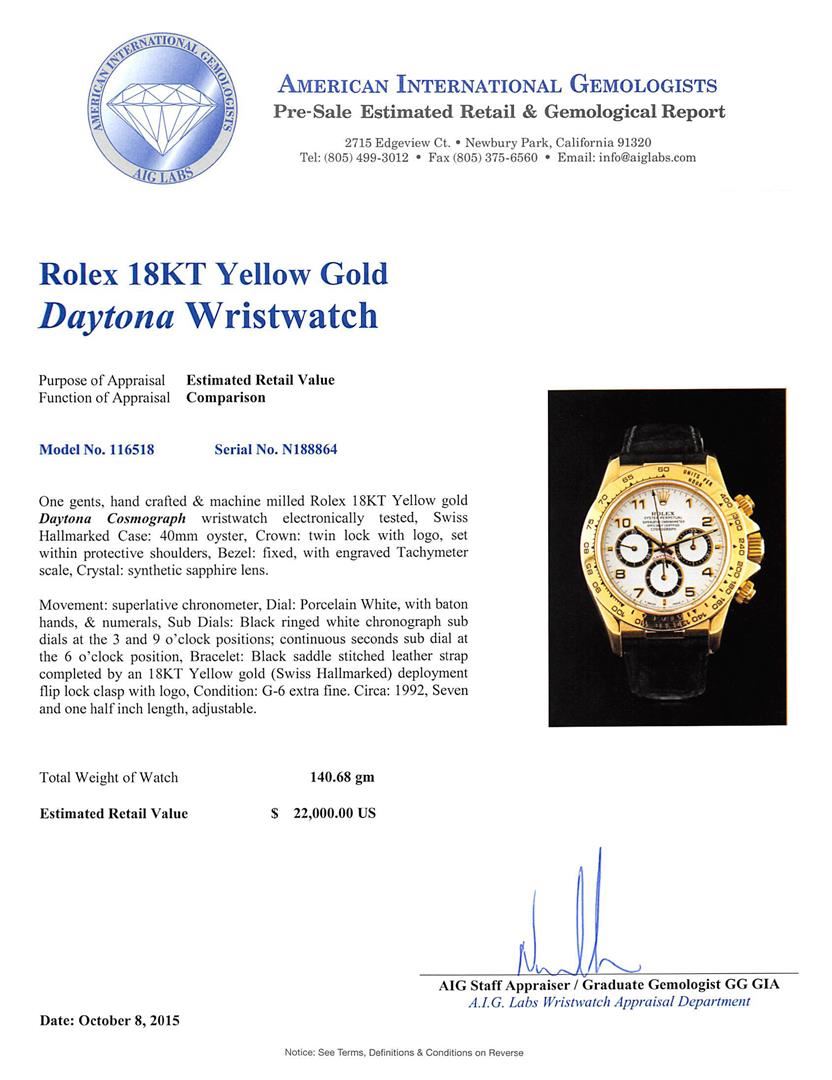 One gents, hand crafted & machine milled Rolex 18KT Yellow gold Daytona Cosmograph wristwatch electronically tested, Swiss Hallmarked Case: 40mm oyster, Crown: twin lock with logo, set within protective shoulders, Bezel: fixed, with engraved Tachymeter scale, Crystal: synthetic sapphire lens. Movement: superlative chronometer, Dial: Porcelain White, with baton hands, & numerals, Sub Dials: Black ringed white chronograph sub dials at the 3 and 9 o'clock positions; continuous seconds sub dial at the 6 o'clock position, Bracelet: Black saddle stitched leather strap completed by an 18KT Yellow gold (Swiss Hallmarked) deployment flip lock clasp with logo, Condition: G-6 extra fine. Circa: 1992, Seven and one half inch length, adjustable. Total Weight of Watch140.68gm. AIG Appraised at $22,000.00.