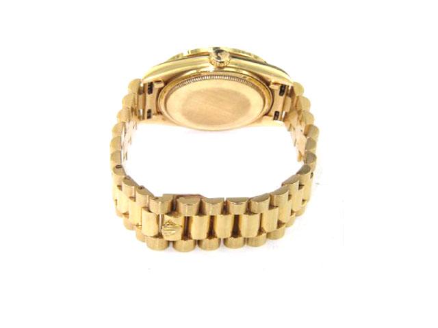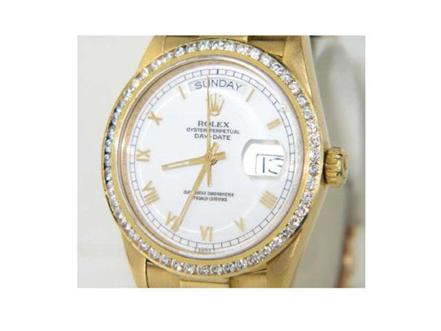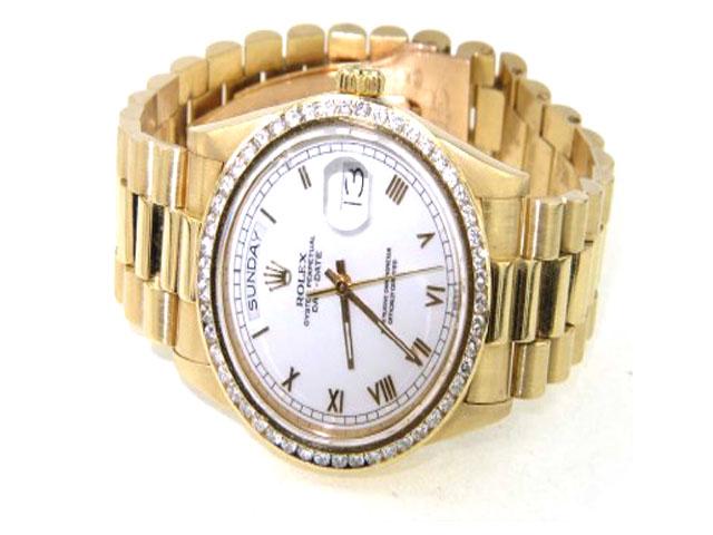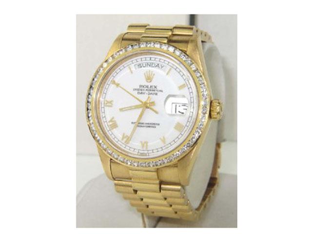 Rolex 18K Yellow Gold Diamond Oyster Perpetual Day-Date, Single QuickSet, Roman Numerals President Watch The total watch's weight is 138.7 grams The total weight of diamond: 1.5 cts. approximately, H color VS clarity The size of watch head: 35 x 35 mm and 11 mm thick The length of the watch is 7.25" Swiss Made Water Resistant Chain is 16 mm wide Diamond bezel is After Market Made