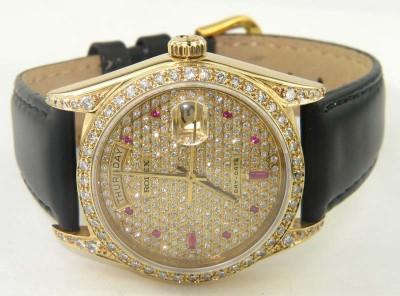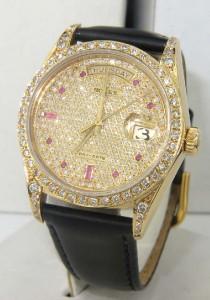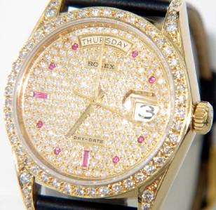 Rolex 18K Yellow Gold Day-Date, Diamond And Ruby, Sapphire Crystal Leather Strap President Watch The total watch's weight is 73.4 grams The total weight of diamond: 3.5 cts. approximately, H color,VS clarity The total weight of ruby: 0.11 cts. approximately After market Diamond And Ruby The size of watch head: 34 x 34 mm and 11 mm thick The length of the watch is 9" Swiss Made Water Resistant