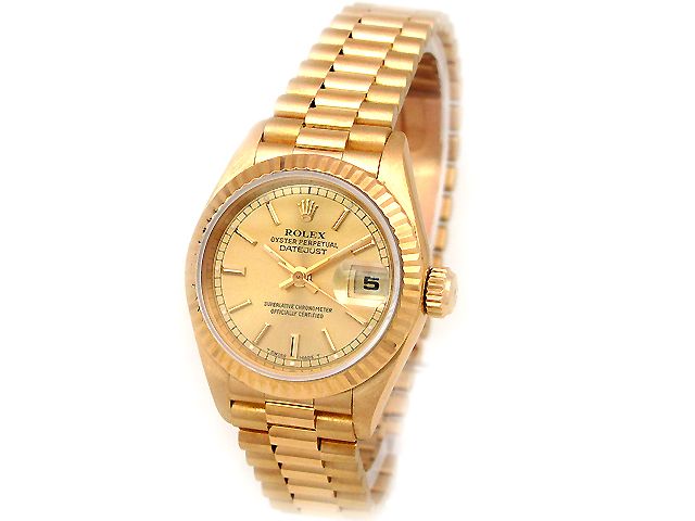 Rolex 18K Yellow Gold Oyster Perpetual Datejust Watch. **|**|** 26MM Lady's Rolex 18K Yellow Gold Oyster Perpetual Datejust Watch. Champagne Dial. 18K Yellow Gold Fluted Bezel. 18K Yellow Gold President Band. Style 69178. ; MSRP: $12800