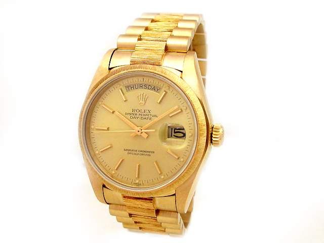Rolex 18K Yellow Gold Oyster Perpetual Daydate Watch **|**|** 36mm Rolex 18K Yellow Gold Oyster Perpetual Daydate Watch. Champagne Dial. 18K Yellow Gold Bark Finish Bezel. 18K Yellow Gold Bark-Finish Band. ; MSRP: $18100
