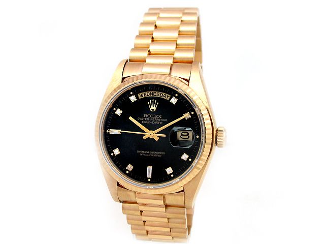 Rolex 18K Yellow Gold Oyster Perpetual Daydate. **|**|** Gents Rolex 18K Yellow Gold Oyster Perpetual Daydate. Black 8+2. 18K Fluted Bezel. 18K Yellow Gold President Band. Style 18038. ; MSRP: $20200