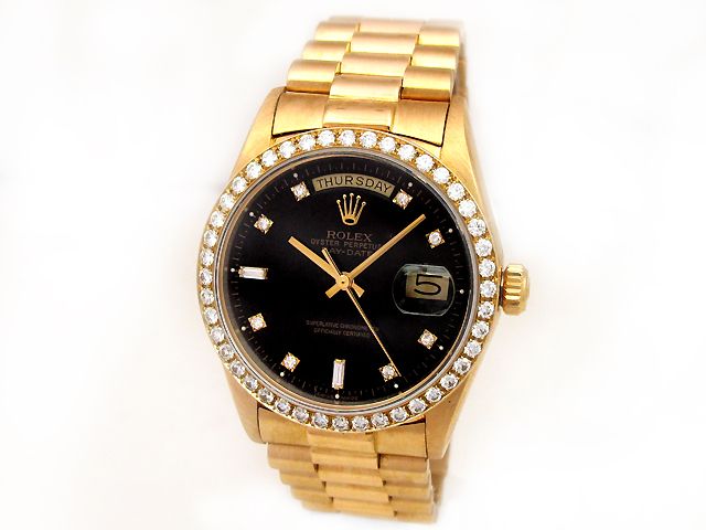 Rolex 18K Yellow Gold Oyster Perpetual Daydate. **|**|** Gents Rolex 18K Yellow Gold Oyster Perpetual Daydate. Black 8+2. 18K Fluted Bezel. 18K Yellow Gold President Band. Style 18038. ; MSRP: $23200