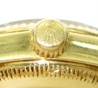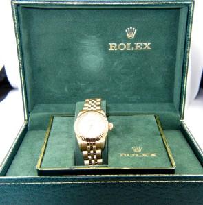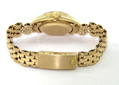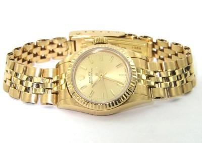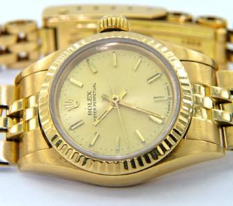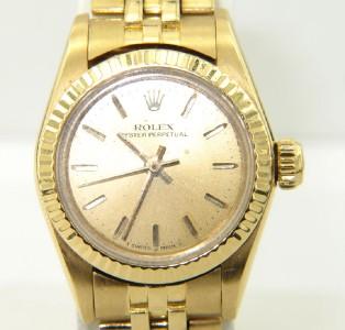 Rolex 18K Yellow Gold, Oyster Perpetual, Ladies Watch.The total watch's weight is 57.9 grams.The size of watch head: 24 x 24 mm and 11 mm thick.The length of the watch is 6.25".Swiss Made.Water Resistant.Chain is 13 mm wide