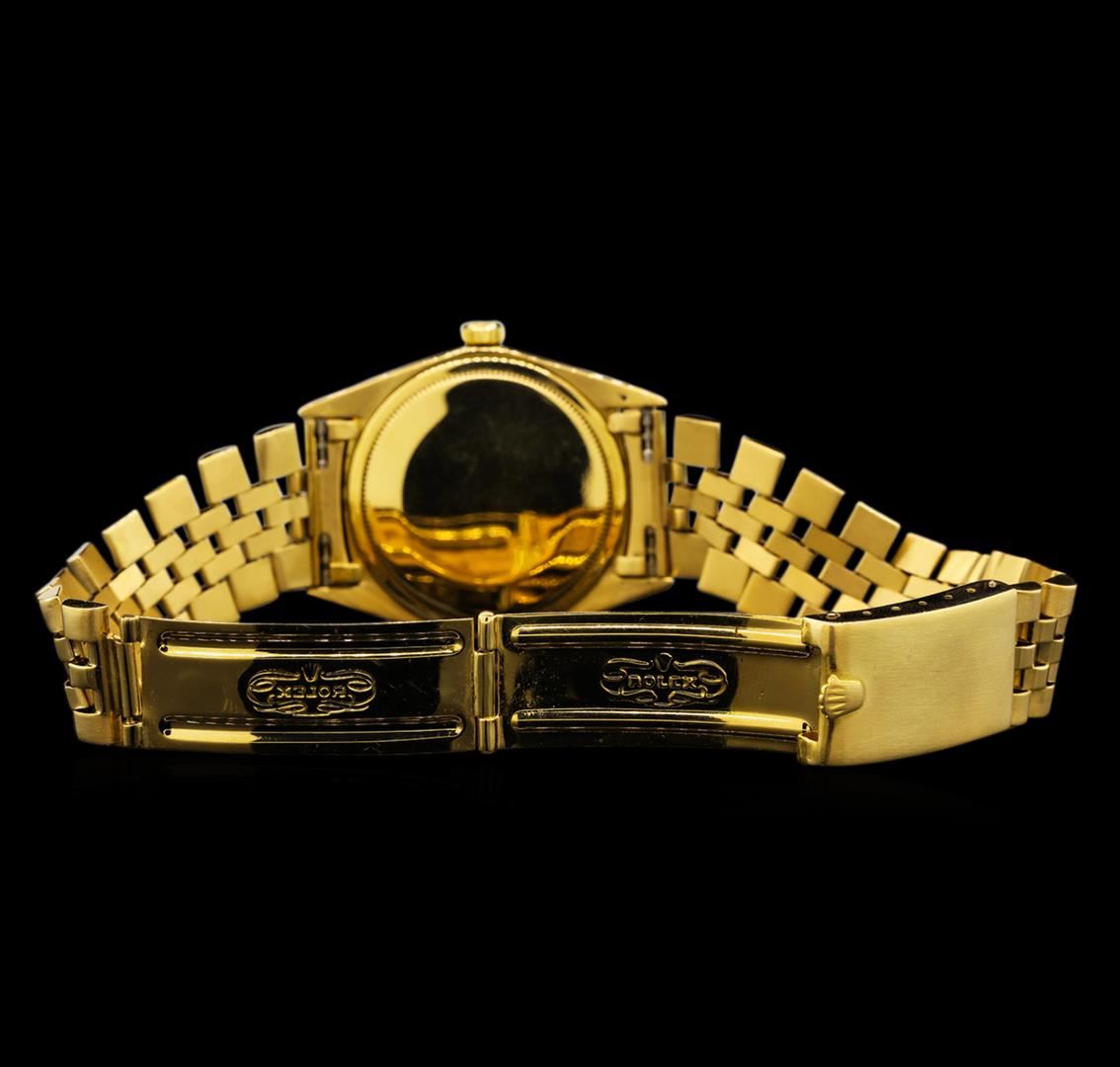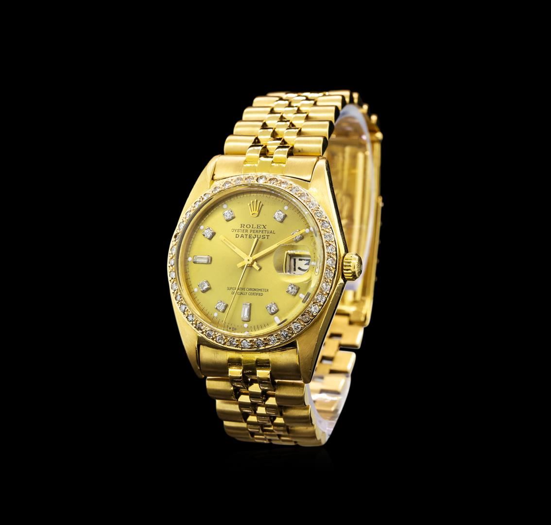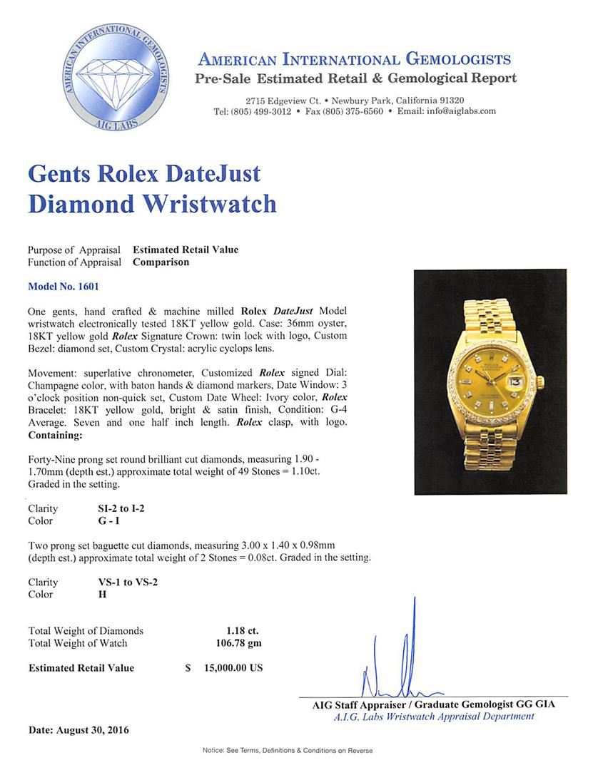 One gents, hand crafted & machine milled Rolex DateJust Model wristwatch electronically tested 18KT yellow gold. Case: 36mm oyster, 18KT yellow gold Rolex Signature Crown: twin lock with logo, Custom Bezel: diamond set, Custom Crystal: acrylic cyclops lens. Movement: superlative chronometer, Customized Rolex signed Dial: Champagne color, with baton hands & diamond markers, Date Window: 3 o'clock position non-quick set, Custom Date Wheel: Ivory color, Rolex Bracelet: 18KT yellow gold, bright & satin finish, Condition: G-4 Average. Seven and one half inch length. Rolex clasp, with logo. Containing: Forty-Nine prong set round brilliant cut diamonds, measuring 1.90 - 1.70mm (depth est.) approximate total weight of 49 Stones = 1.10ct. Graded in the setting. Clarity: SI-2 to I-2 Color G - I Two prong set baguette cut diamonds, measuring 3.00 x 1.40 x 0.98mm (depth est.) approximate total weight of 2 Stones = 0.08ct. Graded in the setting. Clarity: VS-1 to VS-2 Color H. Total Weight of Diamonds 1.18ct. Total Weight of Watch 106.78gm. AIG Appraised at $15,000.00.