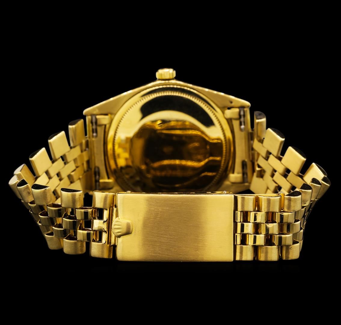 One gents, hand crafted & machine milled Rolex DateJust Model wristwatch electronically tested 18KT yellow gold. Case: 36mm oyster, 18KT yellow gold Rolex Signature Crown: twin lock with logo, Custom Bezel: diamond set, Custom Crystal: acrylic cyclops lens. Movement: superlative chronometer, Customized Rolex signed Dial: Champagne color, with baton hands & diamond markers, Date Window: 3 o'clock position non-quick set, Custom Date Wheel: Ivory color, Rolex Bracelet: 18KT yellow gold, bright & satin finish, Condition: G-4 Average. Seven and one half inch length. Rolex clasp, with logo. Containing: Forty-Nine prong set round brilliant cut diamonds, measuring 1.90 - 1.70mm (depth est.) approximate total weight of 49 Stones = 1.10ct. Graded in the setting. Clarity: SI-2 to I-2 Color G - I Two prong set baguette cut diamonds, measuring 3.00 x 1.40 x 0.98mm (depth est.) approximate total weight of 2 Stones = 0.08ct. Graded in the setting. Clarity: VS-1 to VS-2 Color H. Total Weight of Diamonds 1.18ct. Total Weight of Watch 106.78gm. AIG Appraised at $15,000.00.