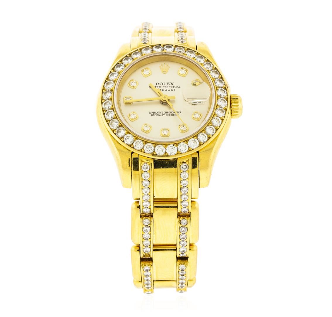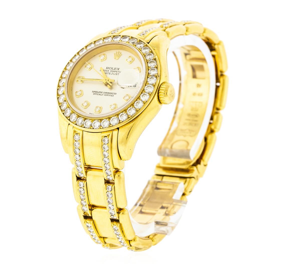 One ladies, hand crafted & machine milled Rolex Masterpiece Pearlmaster DateJust, model wristwatch electronically tested 18KT Yellow gold, Swiss Hallmarked Case: 29mm oyster, Water Resistant: 100 meters / 330 feet, Rolex Signature Crown: twinlock, with logo, Bezel: diamond set, Rolex Hallmarked Crystal: synthetic sapphire cyclops lens. Circa 1995.Movement: superlative chronometer automatic, Rolex signed Dial: Silver color, with baton hands and diamond markers, Date Window: 3 o'clock position, quick set, Rolex Pearlmaster Bracelet: 18KT yellow gold diamond set links, Condition: G-7 Near Mint. Bright polish finish. Six and three quarter inch length. Two removable links. Swiss and Rolex Hallmarked concealed deployment clasp, with logo. Containing: Approximately Two Hundred Four (204) round brilliant & single cut diamonds, estimated total weight equals 4.00ct. Set & graded in the bezel, the dial, and the bracelet. Clarity VVS-1 to VVS-2 Average Color E - F. Total Weight of Diamonds 4.00ct. Total Weight of Watch 106.02gm. AIG Appraised at $60,000.00.