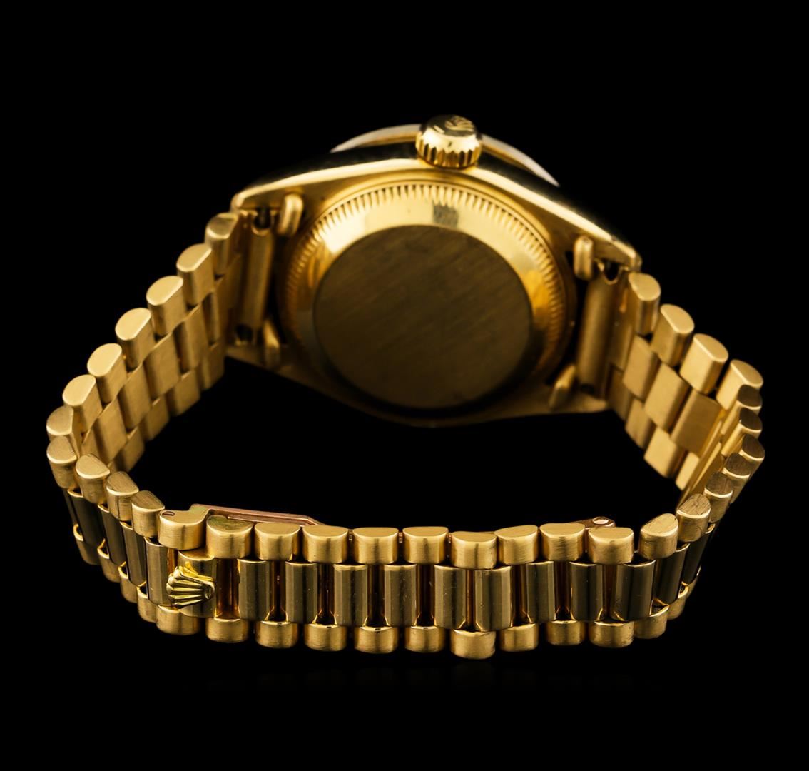 One Rolex DateJust ladies watch featuring: Case: 18KT yellow gold. Bezel: Diamond set yellow gold. Crystal: Scratch-resistant sapphire. Dial: Deep blue color; diamond hour markers. Features: Date window located at the 3 o'clock position. Bracelet: 18KT yellow gold with hidden clasp. Condition: Barely noticeable surface scratches on case, but otherwise there are no major signs of wear.