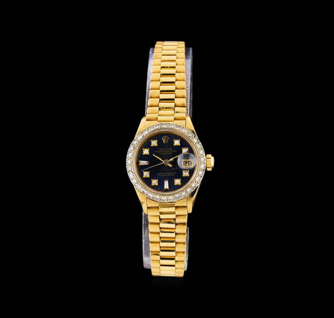 One Rolex DateJust ladies watch featuring: Case: 18KT yellow gold. Bezel: Diamond set yellow gold. Crystal: Scratch-resistant sapphire. Dial: Deep blue color; diamond hour markers. Features: Date window located at the 3 o'clock position. Bracelet: 18KT yellow gold with hidden clasp. Condition: Barely noticeable surface scratches on case, but otherwise there are no major signs of wear.