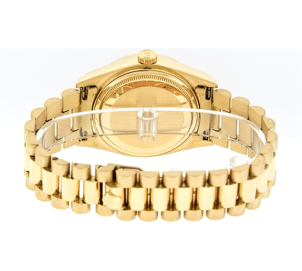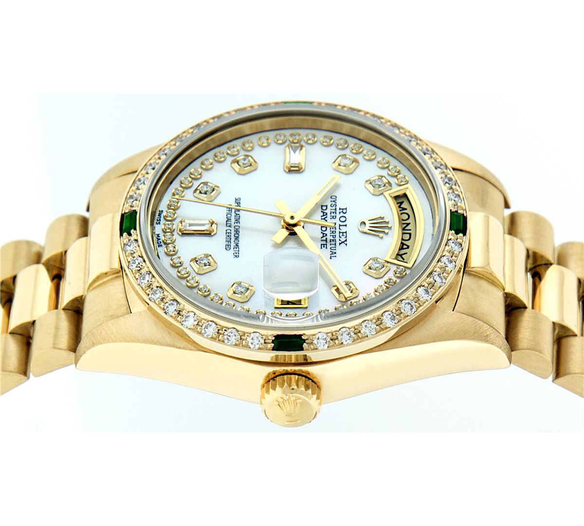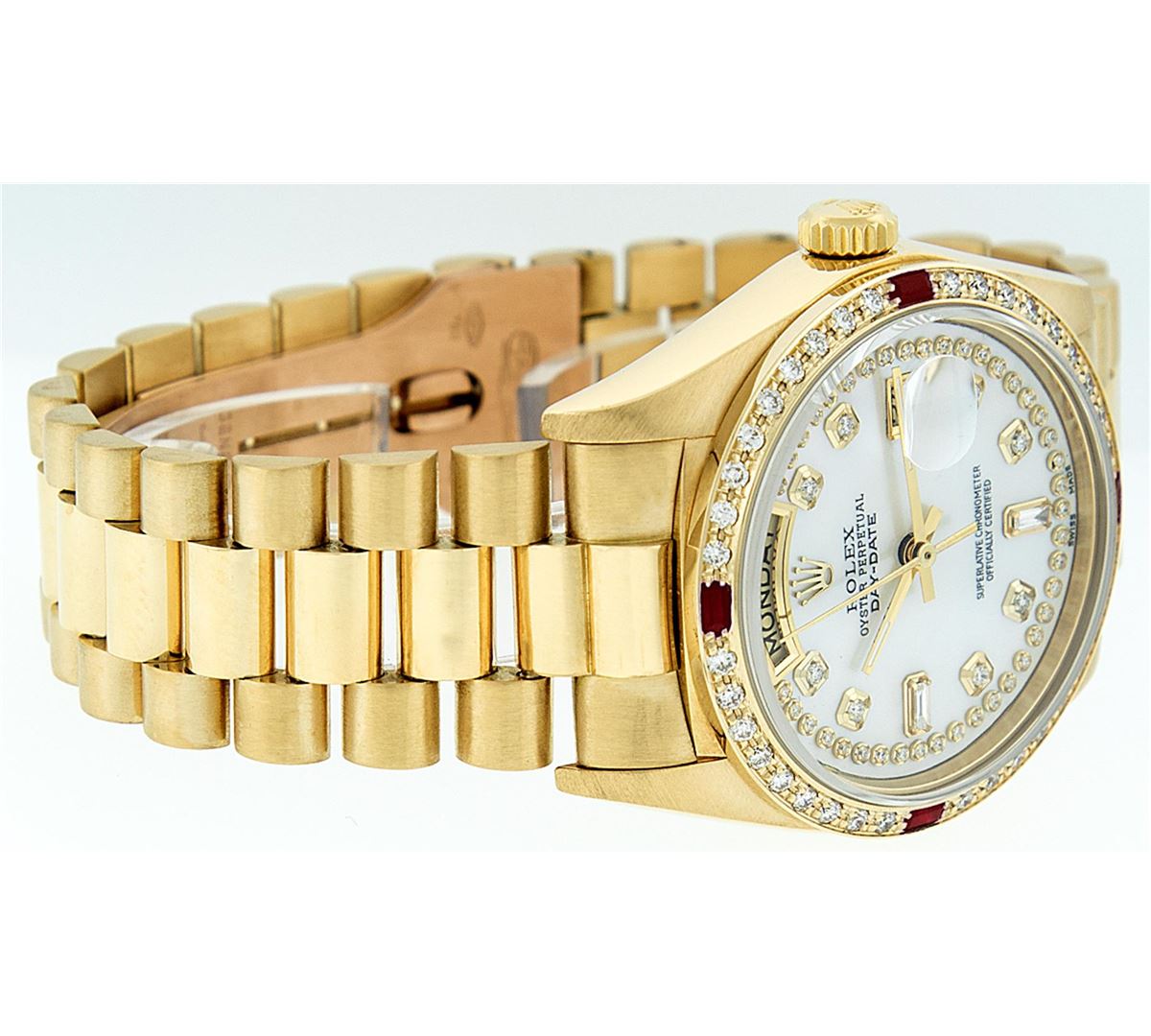 One Mens Rolex Day Date 18K Yellow Gold President Polished, Serviced & Electronically Tested, 18K Yellow Gold Case:36mm, 18K Yellow Gold Crown, Custom Bezel: 18K Yellow Gold Ruby Beadset Diamond Bezel, Diamond + Gem Count: 36 Diamonds + 4 Rubies Total Weight 1.00 Carat, Clarity: SI-VS, Color: G to H. Custom Crystal: Synthetic Sapphire Cyclops Lens. Movement: Automatic Winding Movement Caliber 3055. Custom Dial: Mother Of Pearl String Diamond Dial With 2 Baguettes, (49 Diamond In Dial + 2 Baguette Diamonds In Dial) G To H In Color, Clarity: SI-VS. Date Window: 3 O'Clock Position Date Display, Day Window: 12 O'Clock Position Date Display. Single Quickset, Model: Day Date President. Condition: G-6 Extra Fine. Bracelet: 18K Yellow Gold President. Bright Polish. 7.0 Inch Length, Standard Hidden President Clasp President Band, With Rolex Logo.