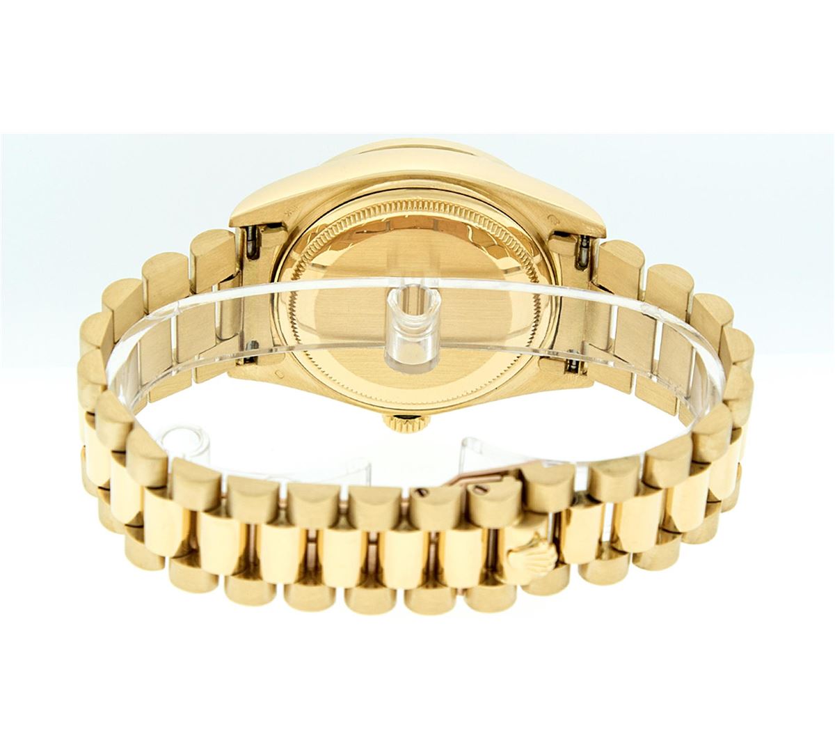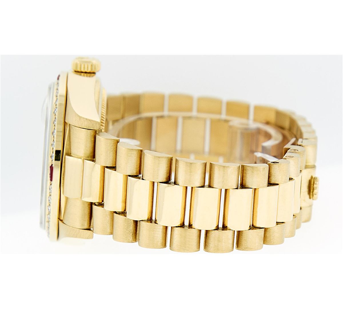 One Mens Rolex Day Date 18K Yellow Gold President Polished, Serviced & Electronically Tested, 18K Yellow Gold Case:36mm, 18K Yellow Gold Crown, Custom Bezel: 18K Yellow Gold Ruby Beadset Diamond Bezel, Diamond + Gem Count: 36 Diamonds + 4 Rubies Total Weight 1.00 Carat, Clarity: SI-VS, Color: G to H. Custom Crystal: Synthetic Sapphire Cyclops Lens. Movement: Automatic Winding Movement Caliber 3055. Custom Dial: Mother Of Pearl String Diamond Dial With 2 Baguettes, (49 Diamond In Dial + 2 Baguette Diamonds In Dial) G To H In Color, Clarity: SI-VS. Date Window: 3 O'Clock Position Date Display, Day Window: 12 O'Clock Position Date Display. Single Quickset, Model: Day Date President. Condition: G-6 Extra Fine. Bracelet: 18K Yellow Gold President. Bright Polish. 7.0 Inch Length, Standard Hidden President Clasp President Band, With Rolex Logo.