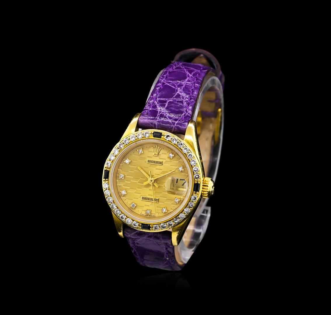 One ladies, hand crafted & machine milled Rolex DateJust model wristwatch electronically tested 18KT yellow gold, Swiss Hallmarked Case: 26mm oyster, Case Back: Personalized engraving, Crown: twinlock with logo, non-factory Custom Bezel: set with diamonds and Blue Sapphires at intervals, non-factory Custom Crystal: synthetic sapphire cyclops lens, Circa: 1987.Movement: superlative chronometer, Rolex signed Customized Dial: Champagne color, featuring the Chevrolet Logo repeated throughout, with baton hands, & diamond markers, Date Display: Ivory color, 3 o'clock position, quick set, Bracelet: saddle stitched leather strap, Condition: G-5 Fine. Bright polish finish. Seven inch length, adjustable. Containing: Thirty Two prong set round brilliant cut diamonds, measuring an average of 1.62mm in diameter, approximate total weight = 0.55ct Set & graded in the custom bezel. Clarity SI-1 to I-1. Color: E - G. Total Weight of Diamonds 0.55ct. Total Weight of Watch 38.31gm. AIG Appraised at $12,100.00.