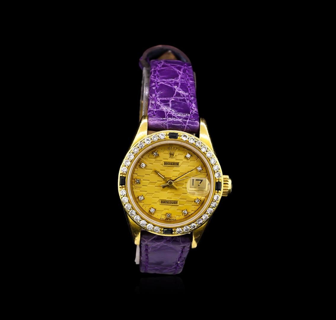One ladies, hand crafted & machine milled Rolex DateJust model wristwatch electronically tested 18KT yellow gold, Swiss Hallmarked Case: 26mm oyster, Case Back: Personalized engraving, Crown: twinlock with logo, non-factory Custom Bezel: set with diamonds and Blue Sapphires at intervals, non-factory Custom Crystal: synthetic sapphire cyclops lens, Circa: 1987.Movement: superlative chronometer, Rolex signed Customized Dial: Champagne color, featuring the Chevrolet Logo repeated throughout, with baton hands, & diamond markers, Date Display: Ivory color, 3 o'clock position, quick set, Bracelet: saddle stitched leather strap, Condition: G-5 Fine. Bright polish finish. Seven inch length, adjustable. Containing: Thirty Two prong set round brilliant cut diamonds, measuring an average of 1.62mm in diameter, approximate total weight = 0.55ct Set & graded in the custom bezel. Clarity SI-1 to I-1. Color: E - G. Total Weight of Diamonds 0.55ct. Total Weight of Watch 38.31gm. AIG Appraised at $12,100.00.