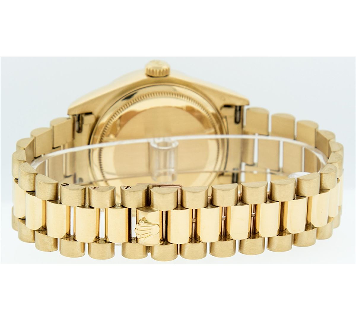 One Mens Rolex Day Date 18K Yellow Gold President Polished, Serviced & Electronically Tested, 18K Yellow Gold Case:36mm, 18K Yellow Gold Crown, Custom Bezel: 18K Yellow Gold Sapphire Beadset Diamond Bezel, Diamond + Gem Count: 36 Diamonds + 4 Sapphires, Total Weight 1.00 Carat, Clarity: SI-VS, Color: G to H. Custom Crystal: Synthetic Sapphire Cyclops Lens. Movement: Automatic Winding Movement Caliber 3055. Custom Dial: Mother Of Pearl String Diamond Dial With 2 Baguettes, (49 Diamond In Dial + 2 Baguette Diamonds In Dial) G To H In Color, Clarity: SI-VS. Date Window: 3 O'Clock Position Date Display, Day Window: 12 O'Clock Position Date Display. Single Quickset, Model: Day Date President. Condition: G-6 Extra Fine. Bracelet: 18K Yellow Gold President. Bright Polish. 7.0 Inch Length, Standard Hidden President Clasp President Band, With Rolex Logo.