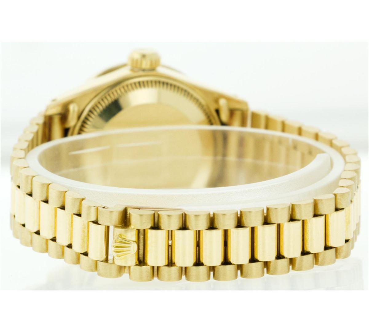 One Ladies Rolex President Polished, Serviced & Electronically Tested, Yellow Gold Case With Diamond Lugs: 26mm G to H In Color, SI1, Yellow Gold Crown, Custom Bezel: 18K Yellow Gold Sapphire Beadset Diamond Bezel, Diamond + Gem Count: 36 Diamonds + 4 Sapphires Total Weight .70 Carat, Clarity: SI-VS, Color: G to H. Custom Crystal: Synthetic Sapphire Cyclops Lens. Movement: Automatic Winding Movement Caliber 2030. Dial: Blue Vignette With Hour Markers, Clarity: SI-VS. Date Window: 3 O'Clock Position, Quickset, Model: 6917 Condition: G-6 Extra Fine. Bracelet: Yellow Gold President, Bright & Satin Polish. 5.5 Inch Length, Standard President Clasp (Hidden Clasp), With Rolex Logo.