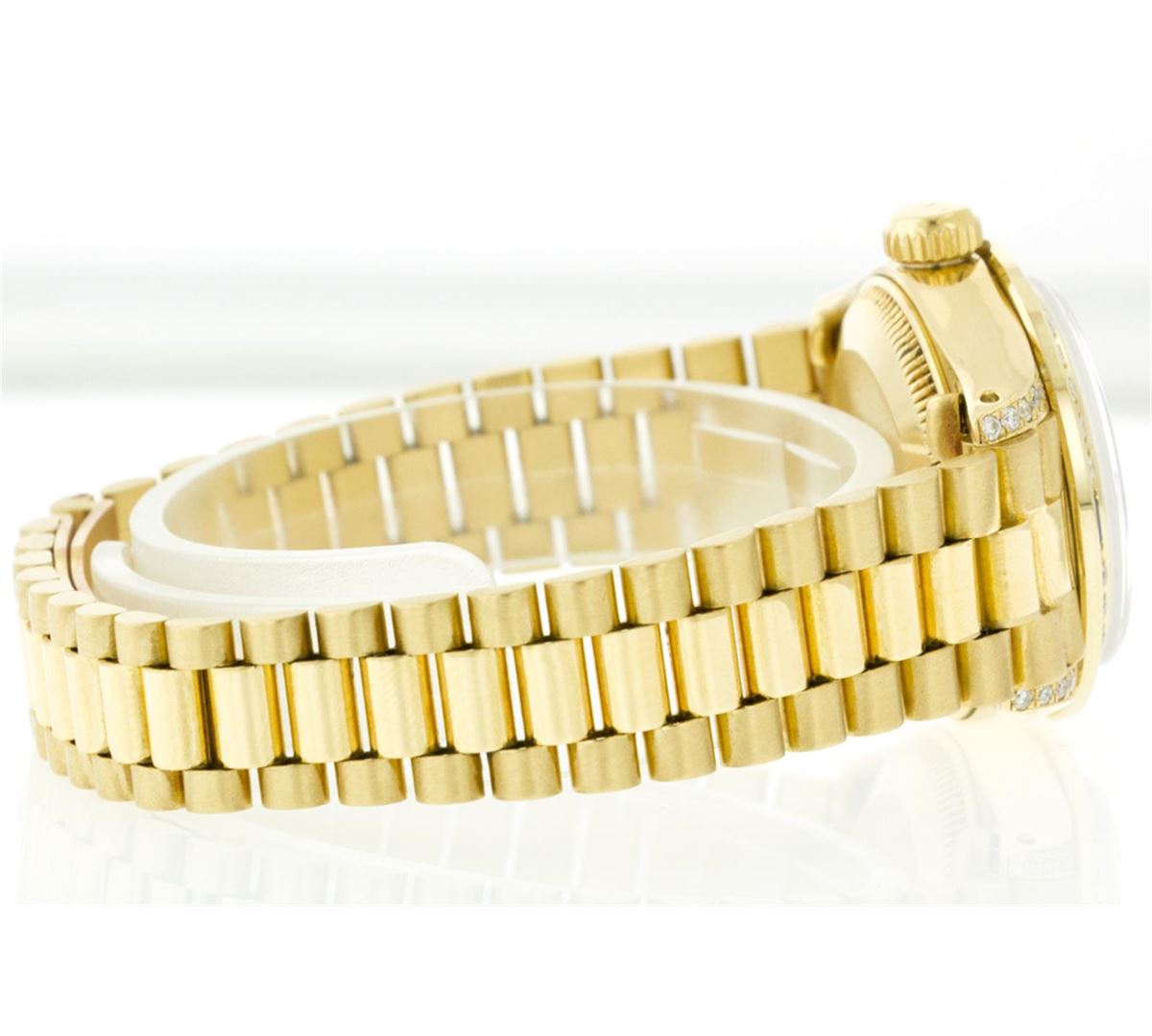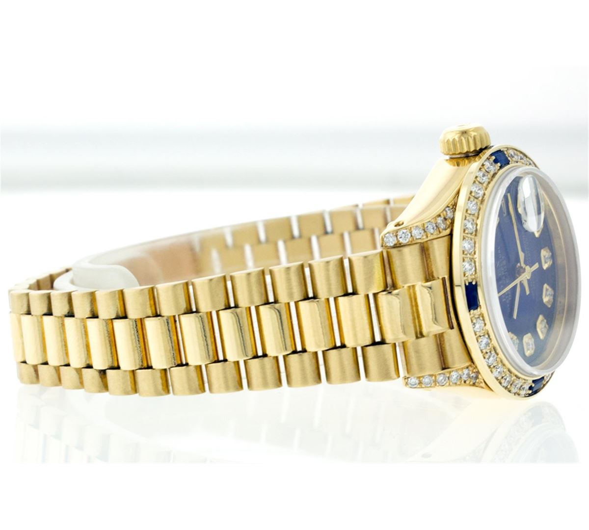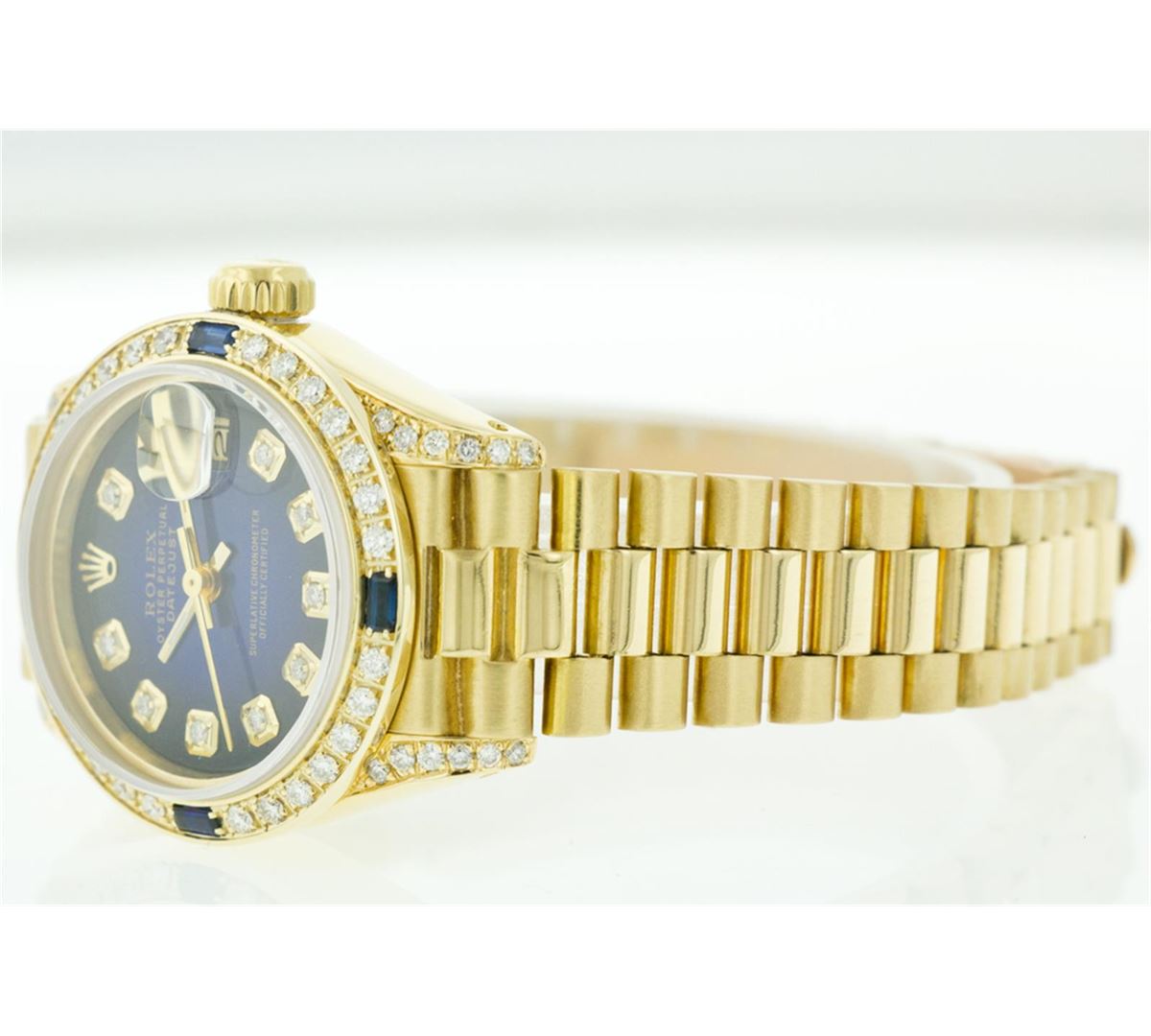 One Ladies Rolex President Polished, Serviced & Electronically Tested, Yellow Gold Case With Diamond Lugs: 26mm G to H In Color, SI1, Yellow Gold Crown, Custom Bezel: 18K Yellow Gold Sapphire Beadset Diamond Bezel, Diamond + Gem Count: 36 Diamonds + 4 Sapphires Total Weight .70 Carat, Clarity: SI-VS, Color: G to H. Custom Crystal: Synthetic Sapphire Cyclops Lens. Movement: Automatic Winding Movement Caliber 2030. Dial: Blue Vignette With Hour Markers, Clarity: SI-VS. Date Window: 3 O'Clock Position, Non Quickset, Model: 6917 Condition: G-6 Extra Fine. Bracelet: Yellow Gold President, Bright & Satin Polish. 5.5 Inch Length, Standard President Clasp (Hidden Clasp), With Rolex Logo.