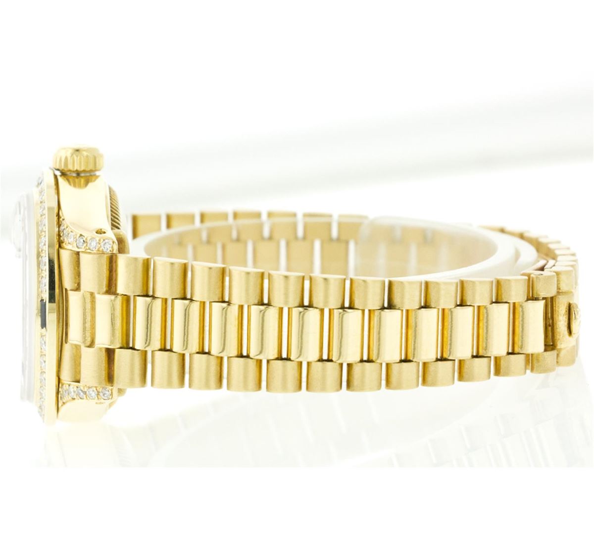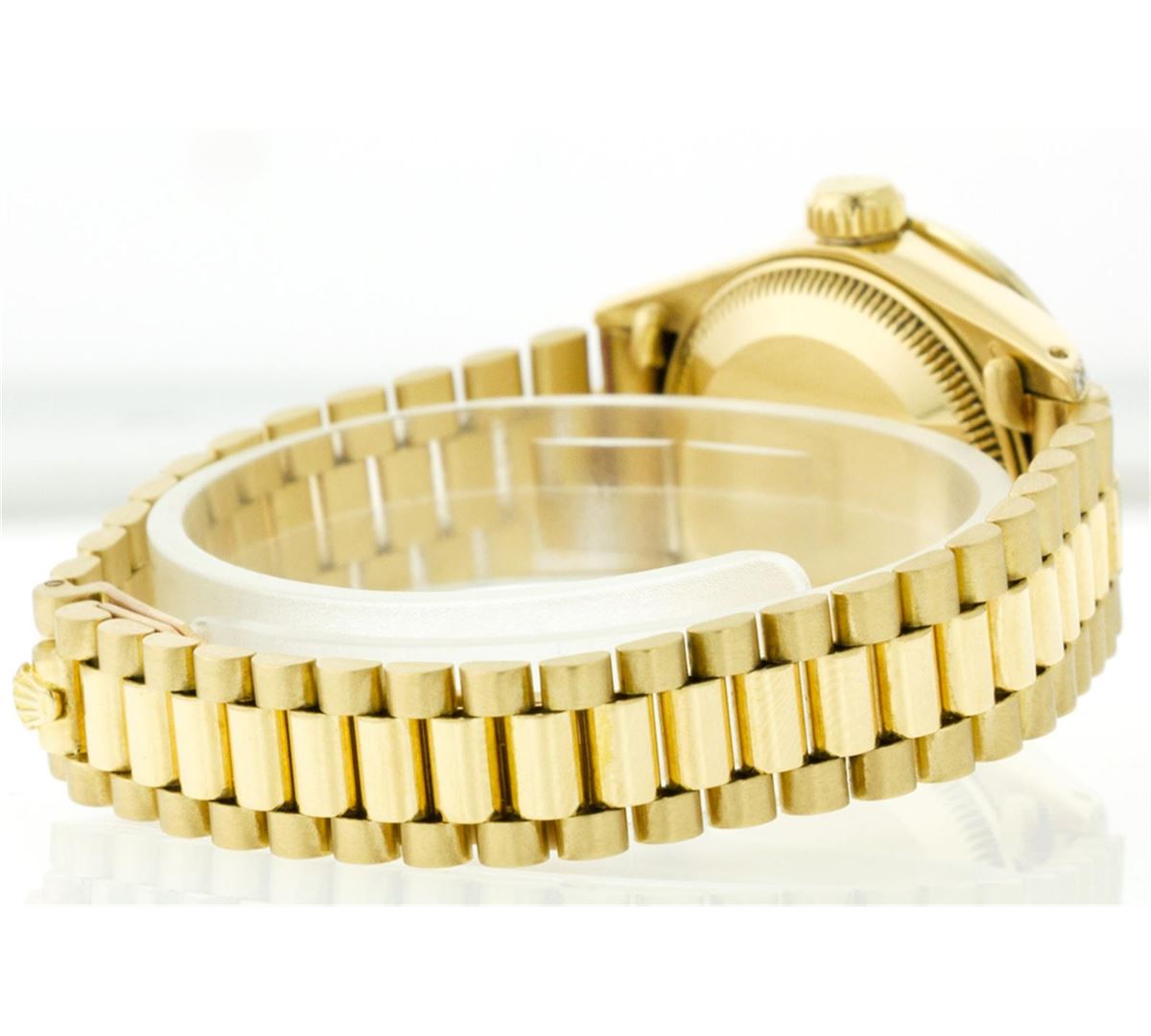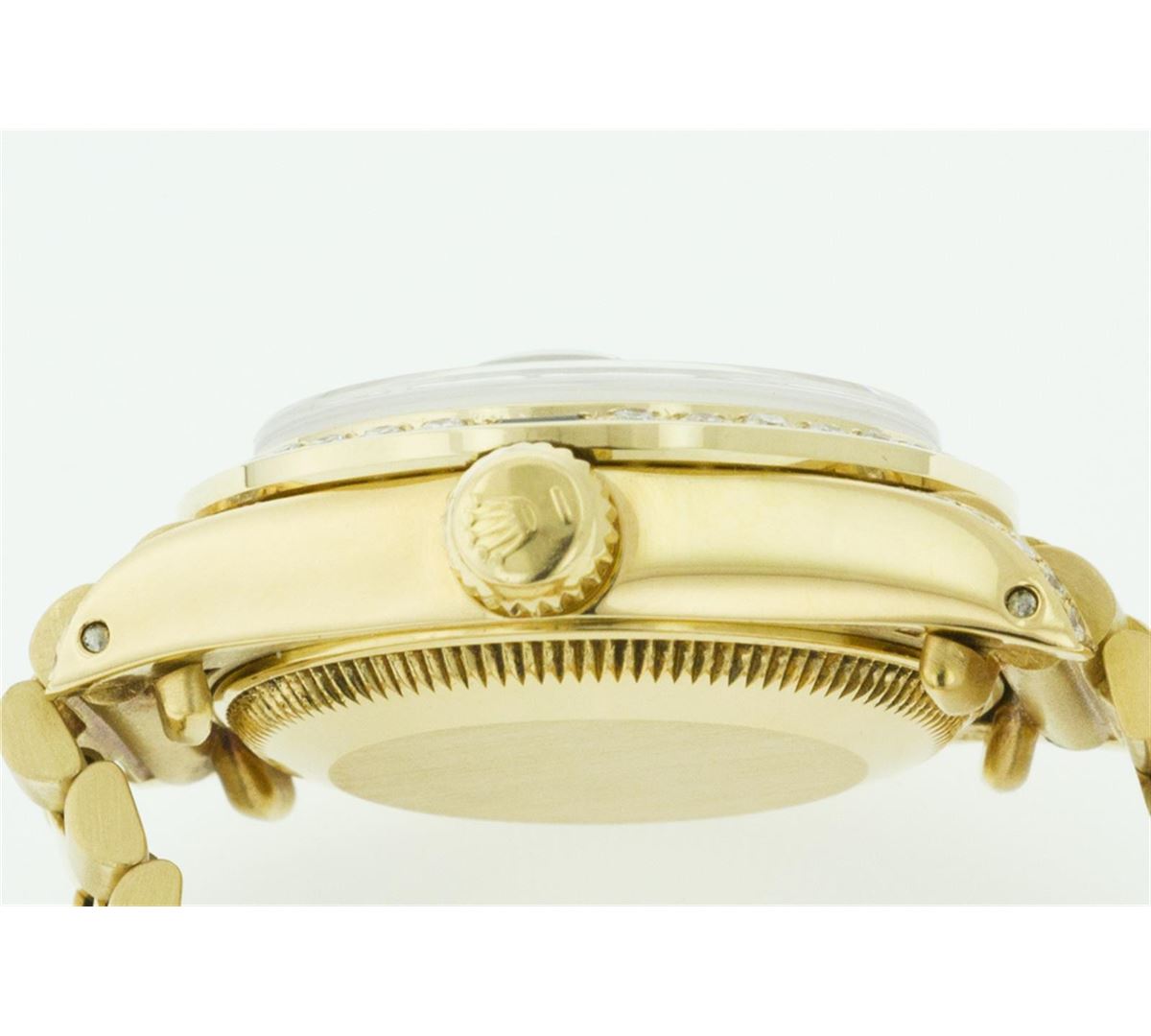 One Ladies Rolex President Polished, Serviced & Electronically Tested, Yellow Gold Case With Diamond Lugs: 26mm G to H In Color, SI1, Yellow Gold Crown, Custom Bezel: 18K Yellow Gold Sapphire Beadset Diamond Bezel, Diamond + Gem Count: 36 Diamonds + 4 Sapphires Total Weight .70 Carat, Clarity: SI-VS, Color: G to H. Custom Crystal: Synthetic Sapphire Cyclops Lens. Movement: Automatic Winding Movement Caliber 2030. Dial: Blue Vignette With Hour Markers, Clarity: SI-VS. Date Window: 3 O'Clock Position, Non Quickset, Model: 6917 Condition: G-6 Extra Fine. Bracelet: Yellow Gold President, Bright & Satin Polish. 5.5 Inch Length, Standard President Clasp (Hidden Clasp), With Rolex Logo.