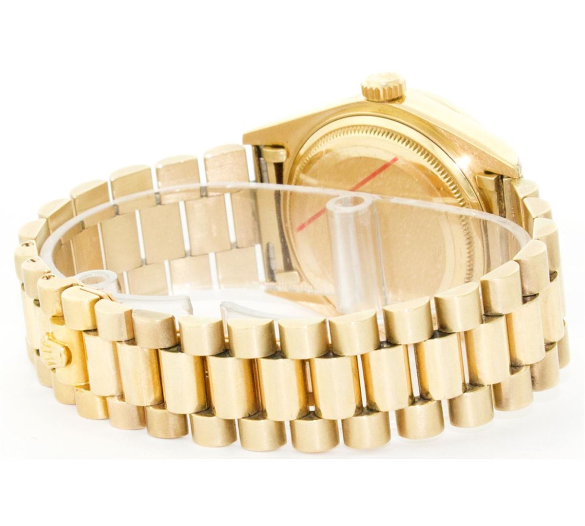 One Mens Rolex Day Date President Polished, Serviced & Electronically Tested, Yellow Gold Case:36mm, Diamond Lug Case: Clarity: SI-VS, Color G To H. Yellow Gold Crown, Bezel: Custom 18K Yellow Gold Beadset Diamond Bezel, Diamond Count: 44Diamonds Total Weight 1.00 Carat, Clarity: SI-VS, Color: G to H. Custom Crystal: Synthetic Sapphire Cyclops Lens. Movement: Automatic Winding Movement Caliber 3055. Custom Dial: Blue Vignette Diamond & Baguette Dial, (8 Diamond + 2 Baguette Diamonds In Dial) G To H In Color, Clarity: SI-VS. Date Window: 3 O'Clock Position Date Display, Day Display: 12 O'Clock Position. Quickset, Model: 18038. Condition: G-6 Extra Fine. Bracelet: Yellow Gold President. Bright Polish. 6.5 Inch Length, Standard President Hidden Clasp, With Rolex Logo.