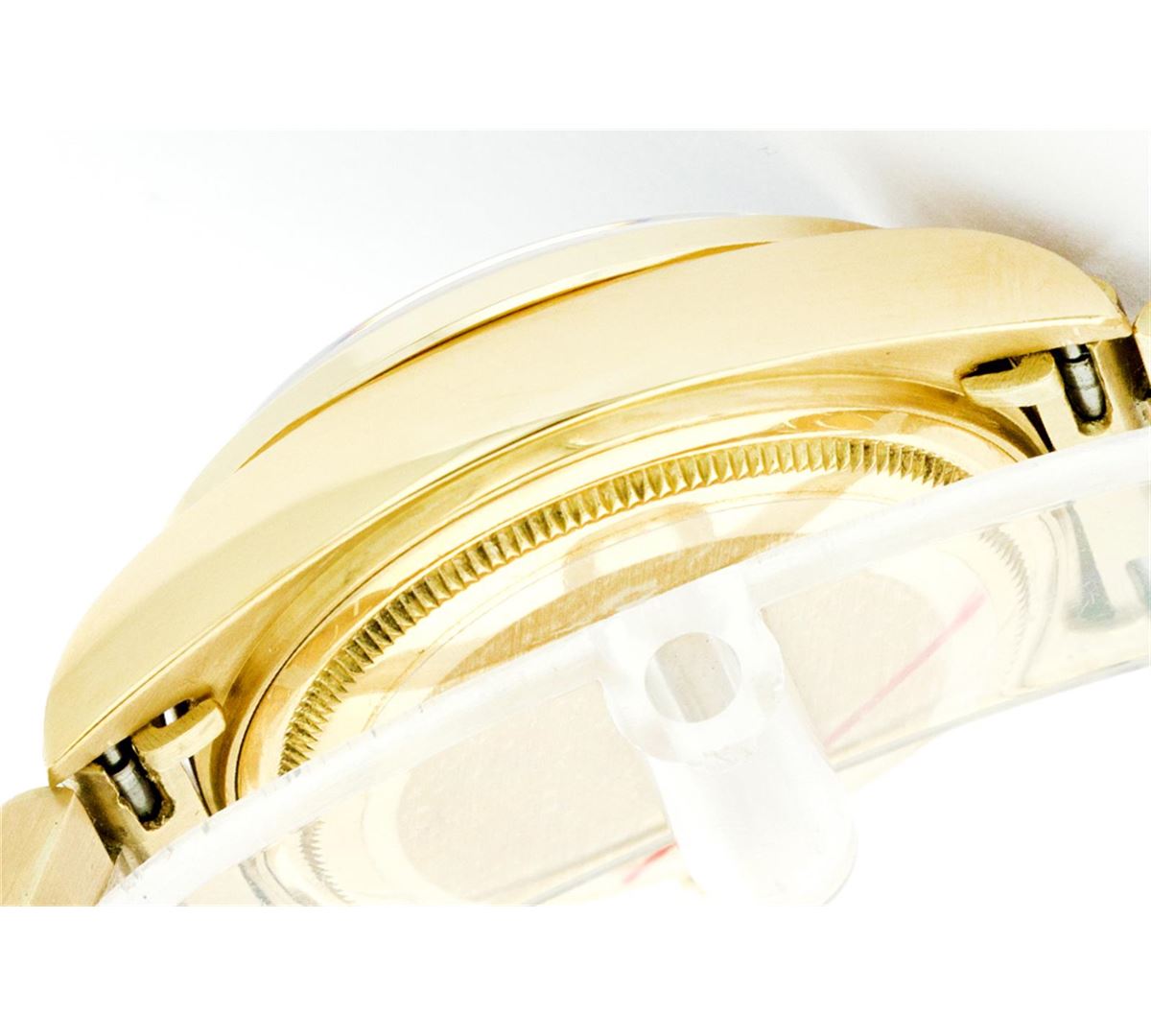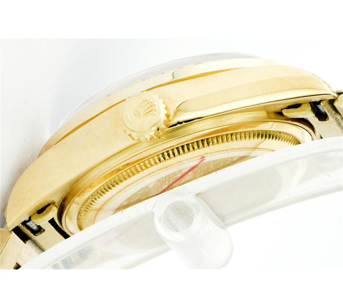 One Mens Rolex Day Date President Polished, Serviced & Electronically Tested, Yellow Gold Case:36mm, Diamond Lug Case: Clarity: SI-VS, Color G To H. Yellow Gold Crown, Bezel: Custom 18K Yellow Gold Beadset Diamond Bezel, Diamond Count: 44Diamonds Total Weight 1.00 Carat, Clarity: SI-VS, Color: G to H. Custom Crystal: Synthetic Sapphire Cyclops Lens. Movement: Automatic Winding Movement Caliber 3055. Custom Dial: Blue Vignette Diamond & Baguette Dial, (8 Diamond + 2 Baguette Diamonds In Dial) G To H In Color, Clarity: SI-VS. Date Window: 3 O'Clock Position Date Display, Day Display: 12 O'Clock Position. Quickset, Model: 18038. Condition: G-6 Extra Fine. Bracelet: Yellow Gold President. Bright Polish. 6.5 Inch Length, Standard President Hidden Clasp, With Rolex Logo.