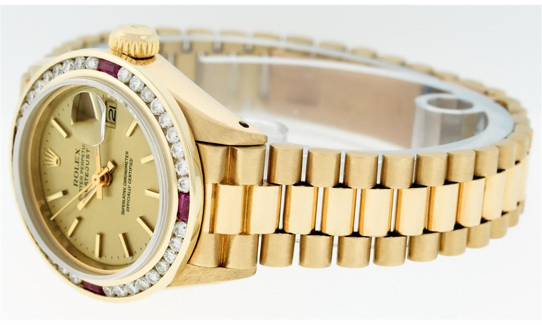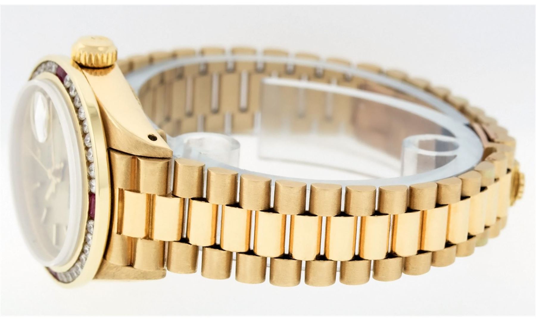 One Ladies 18K Yellow Gold Rolex President Polished, Serviced & Electronically Tested, 18K Yellow Gold Case: 26mm, 18K Yellow Gold Crown, Custom Bezel: 18K Yellow Gold Ruby Channel-Set Diamond Bezel, Diamond + Stone Count: 36 Diamonds + 4 Rubies. Total Weight 1.00 Carat, Clarity: SI-VS, Color: G to H. Custom Crystal: Synthetic Sapphire Cyclops Lens. Movement: Automatic Winding Movement Caliber 2030. Dial: Champagne Index Dial With Line Track & Lumi Dots. Date Window: 3 O'Clock Position, Model: President, Condition: G-6 Extra Fine The Watch Is In Very Good Condition Free Of All Scratches And Dents. Bracelet: 18K Yellow Gold President With Hidden Clasp, Bright & Satin Polish. 6.0 Inch Length, Standard President Clasp (Hidden Clasp), With Rolex Logo. Comes with 6 month warranty.