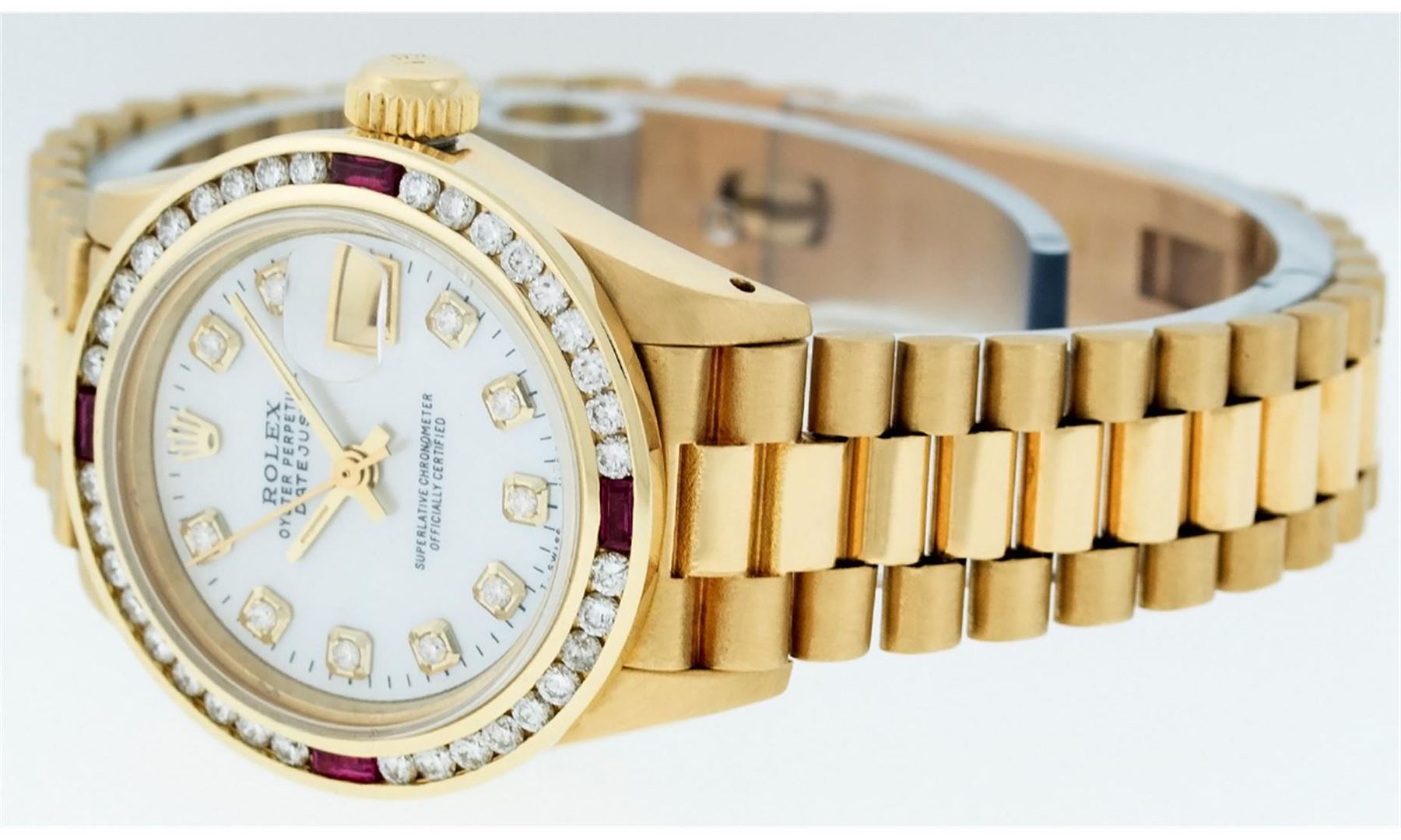 One Ladies 18K Rolex President Polished, Serviced & Electronically Tested, 18K Yellow Gold Case: 26mm, 18K Yellow Gold Crown, Custom Bezel: 18K Yellow Gold Ruby Channel Set Diamond Bezel, Diamond + Stone Count: 36 Diamonds + 4 Rubies. Total Weight 1.00 Carat, Clarity: SI-VS, Color: G to H. Custom Crystal: Synthetic Sapphire Cyclops Lens. Movement: Automatic Winding Movement Caliber 2030. Custom Dial: Mother Of Pearl Diamond Dial With Line Track, Diamond Count: 10 Diamonds In Dial, Color: G To H, Clarity: SI-VS. Date Window: 3 O'Clock Position, Model: President, Condition: G-6 Extra Fine The Watch Is In Very Good Condition Free Of All Scratches And Dents. Bracelet: 18K Yellow Gold President With Hidden Clasp, Bright & Satin Polish. 6.0 Inch Length, Standard President Clasp (Hidden Clasp), With Rolex Logo. Comes with 6 month warranty.