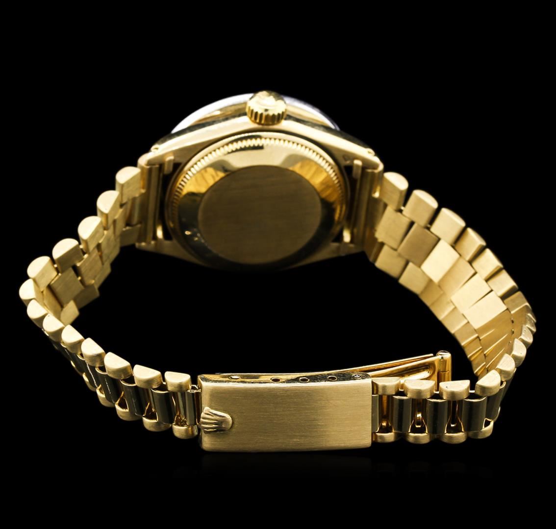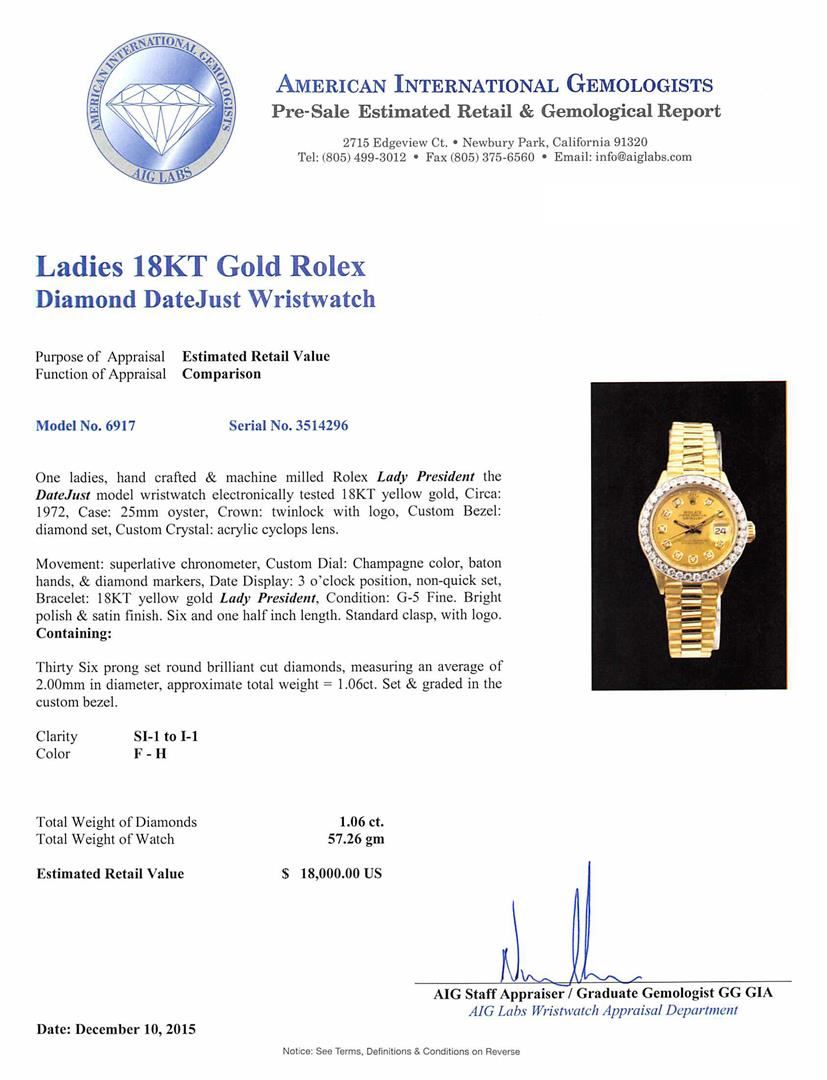 One ladies, hand crafted & machine milled Rolex Lady President the DateJust model wristwatch electronically tested 18KT yellow gold, Circa: 1972, Case: 25mm oyster, Crown: twinlock with logo, Custom Bezel: diamond set, Custom Crystal: acrylic cyclops lens. Movement: superlative chronometer, Custom Dial: Champagne color, baton hands, & diamond markers, Date Display: 3 o'clock position, non-quick set, Bracelet: 18KT yellow gold Lady President, Condition: G-5 Fine. Bright polish & satin finish. Six and one half inch length. Standard clasp, with logo. Containing: Thirty Six prong set round brilliant cut diamonds, measuring an average of 2.00mm in diameter, approximate total weight = 1.06ct. Set & graded in the custom bezel. Clarity SI-1 to I-1. Color: F - H. Total Weight of Diamonds 1.06ct. Total Weight of Watch 57.26gm. AIG Appraised at $18,000.00.