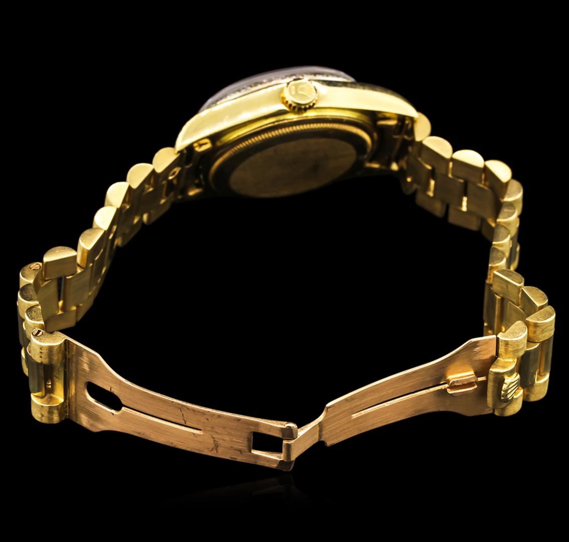 One gents, Rolex DayDate Model the President wristwatch electronically tested 18KT yellow gold, Swiss Hallmarked Case: 36mm oyster, Crown: twin lock with logo, non-factory custom Bezel: diamond set, non-factory custom Crystal: synthetic sapphire cyclops lens. Circa: 1979.Movement: superlative chronometer, Dial: Champagne, with baton hands, round & baguette diamond markers, Calendar: single-quick set, President Bracelet: 18KT yellow gold, bright and brushed finish, Condition: G-4 Average. Seven and one quarter inch length. Swiss Hallmarked concealed deployment clasp, with logo Containing: Sixty Four prong & bead set round brilliant and single cut diamonds, approximate total weight equals 1.24ct. Set & graded in the bezel, the bracelet and case lugs. Clarity: VS-2 to SI-2 Average. Color: H - I. Total Weight of Diamonds 1.24ct. Total Weight of Watch 124.48gm. AIG Appraised at $20,440.00.