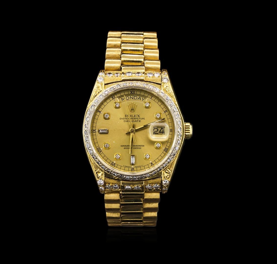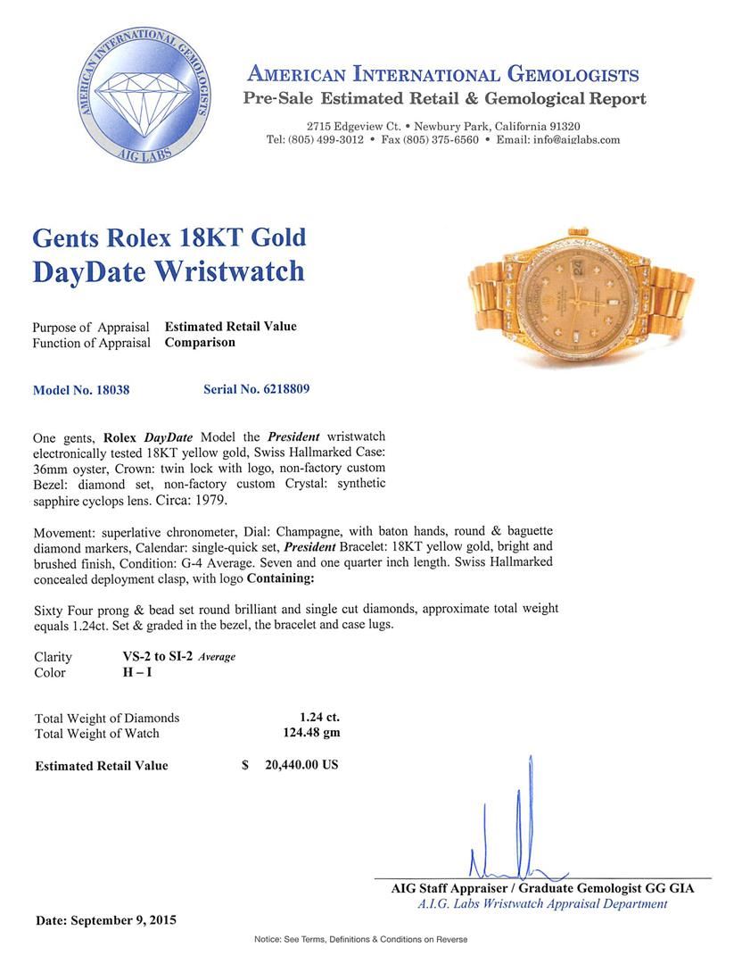 One gents, Rolex DayDate Model the President wristwatch electronically tested 18KT yellow gold, Swiss Hallmarked Case: 36mm oyster, Crown: twin lock with logo, non-factory custom Bezel: diamond set, non-factory custom Crystal: synthetic sapphire cyclops lens. Circa: 1979.Movement: superlative chronometer, Dial: Champagne, with baton hands, round & baguette diamond markers, Calendar: single-quick set, President Bracelet: 18KT yellow gold, bright and brushed finish, Condition: G-4 Average. Seven and one quarter inch length. Swiss Hallmarked concealed deployment clasp, with logo Containing: Sixty Four prong & bead set round brilliant and single cut diamonds, approximate total weight equals 1.24ct. Set & graded in the bezel, the bracelet and case lugs. Clarity: VS-2 to SI-2 Average. Color: H - I. Total Weight of Diamonds 1.24ct. Total Weight of Watch 124.48gm. AIG Appraised at $20,440.00.