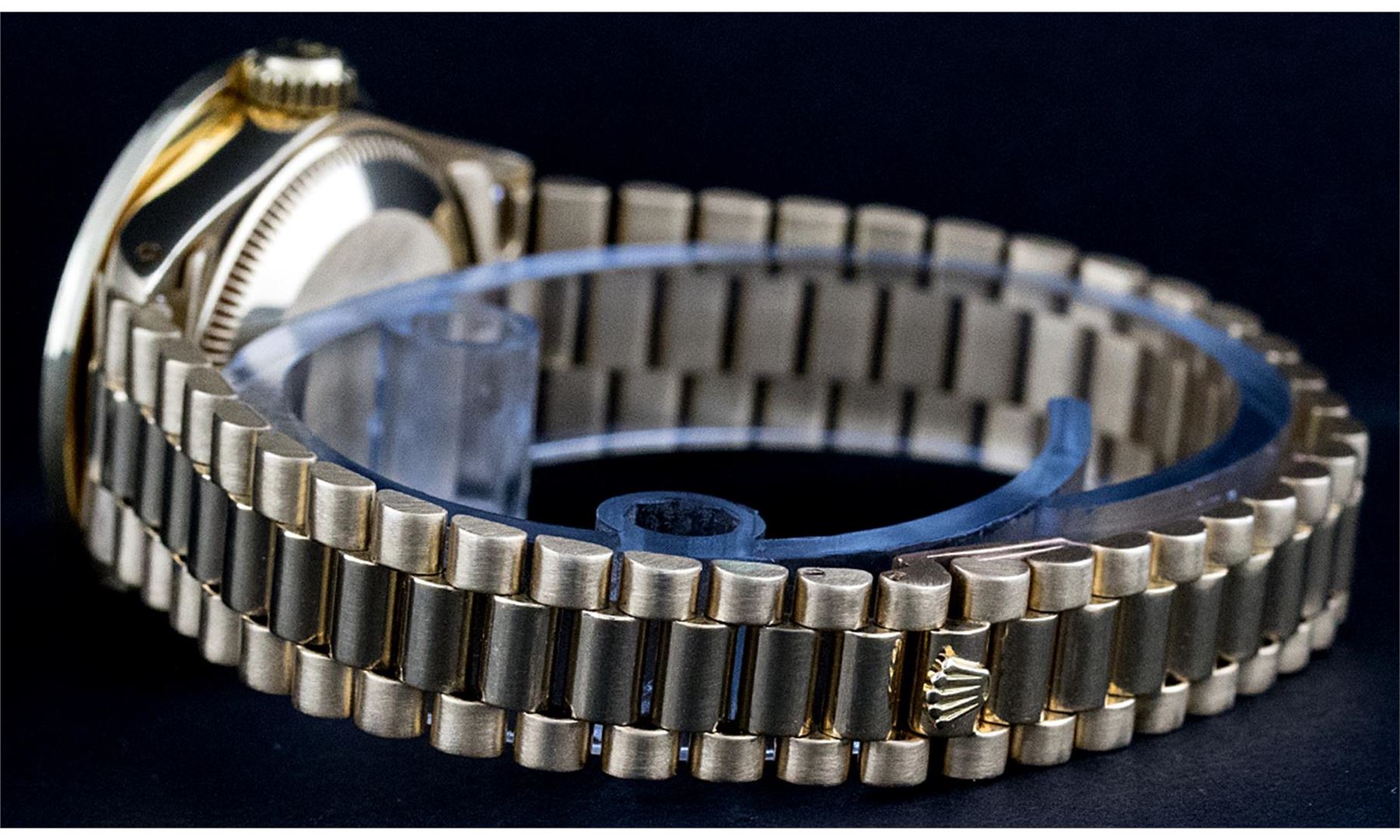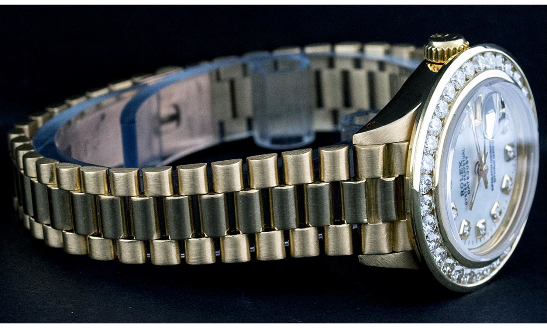 One Ladies 18K Rolex President Polished, Serviced & Electronically Tested, 18K Yellow Gold Case: 26mm, 18K Yellow Gold Crown, Custom Bezel: 18K Yellow Gold 2ctw Channel Set Diamond Bezel, Diamond Count: 32 Diamonds Total Weight 2.00 Carat, Clarity: SI-VS, Color: G to H. Custom Crystal: Synthetic Sapphire Crystal, Cyclops Lens. Movement: Automatic Winding Movement Caliber 2030. Custom Dial: Mother Of Pearl Diamond Dial With Line Track, Diamond Count: 10 Diamonds In Dial, Clarity: SI-VS, Color: G to H. Date Window: 3 O'Clock Position, Model: Datejust, Condition: G-6 Extra Fine. Bracelet: 18K Yellow Gold President With Hidden Clasp, Bright & Satin Polish. 6.0 Inch Length, Standard President Clasp (Hidden Clasp), With Rolex Logo.