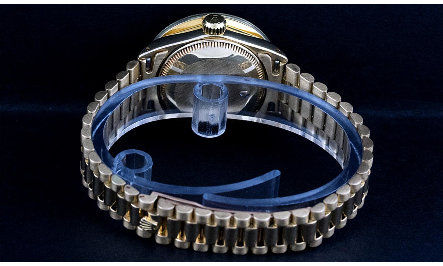 One Ladies 18K Rolex President Polished, Serviced & Electronically Tested, 18K Yellow Gold Case: 26mm, 18K Yellow Gold Crown, Custom Bezel: 18K Yellow Gold 2ctw Channel Set Diamond Bezel, Diamond Count: 32 Diamonds Total Weight 2.00 Carat, Clarity: SI-VS, Color: G to H. Custom Crystal: Synthetic Sapphire Crystal, Cyclops Lens. Movement: Automatic Winding Movement Caliber 2030. Custom Dial: Mother Of Pearl Diamond Dial With Line Track, Diamond Count: 10 Diamonds In Dial, Clarity: SI-VS, Color: G to H. Date Window: 3 O'Clock Position, Model: Datejust, Condition: G-6 Extra Fine. Bracelet: 18K Yellow Gold President With Hidden Clasp, Bright & Satin Polish. 6.0 Inch Length, Standard President Clasp (Hidden Clasp), With Rolex Logo.