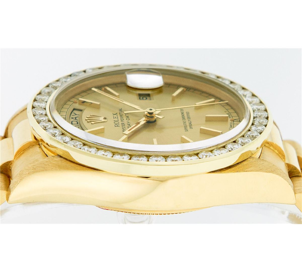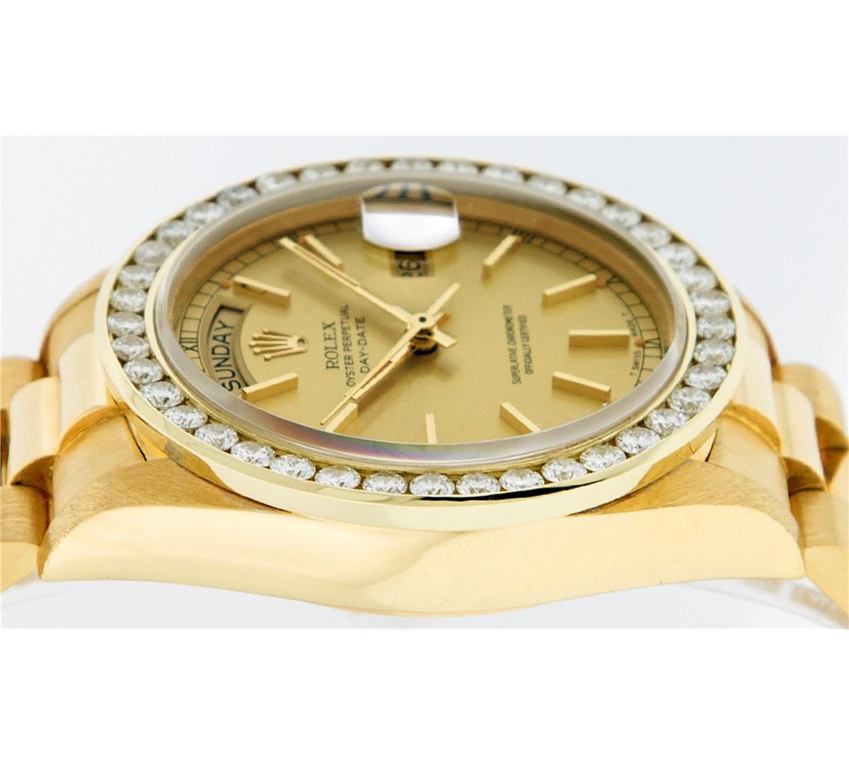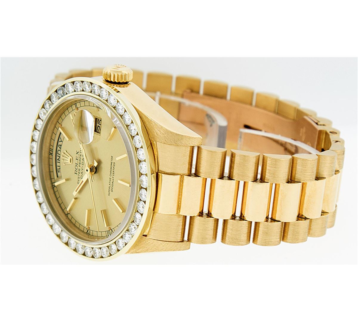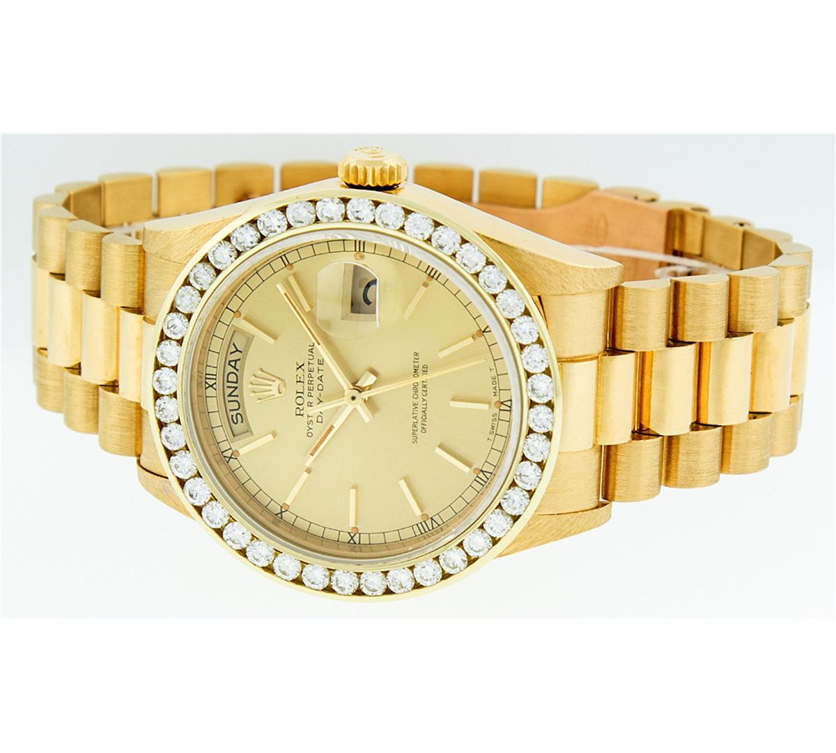 One Mens Rolex Day Date 18K Yellow Gold President Polished, Serviced & Electronically Tested, 18K Yellow Gold Case:36mm, 18K Yellow Gold Crown, Custom Bezel: 18K Yellow Gold Channel Set Diamond Bezel, Diamond Count: 40 Diamonds In Bezel. Total Weight 3.0 Carat, Clarity: SI-VS, Color: G to H. Custom Crystal: Synthetic Sapphire Cyclops Lens. Movement: Automatic Winding Movement Caliber 3055. Dial: Champagne Index With Square Roman Track. Date Window: 3 O'Clock Position Date Display, Day Window: 12 O'Clock Position Date Display. Quickset, Model: Day Date President. Condition: G-6 Extra Fine The Watch Is In Very Good Condition Free Of All Scratches And Dents. Bracelet: 18K Yellow Gold President. Bright Polish. 7.0 Inch Length, Standard Hidden President Clasp President Band, With Rolex Logo. Comes with 6 month warranty.