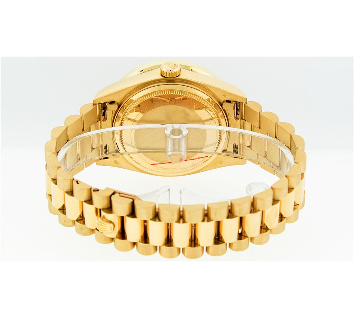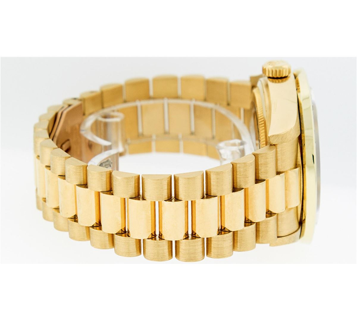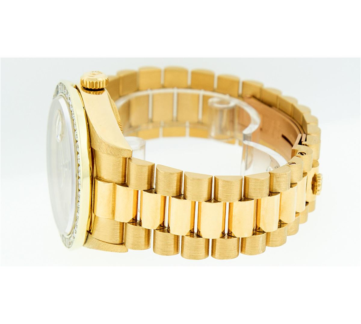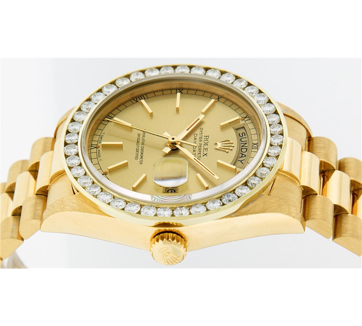 One Mens Rolex Day Date 18K Yellow Gold President Polished, Serviced & Electronically Tested, 18K Yellow Gold Case:36mm, 18K Yellow Gold Crown, Custom Bezel: 18K Yellow Gold Channel Set Diamond Bezel, Diamond Count: 40 Diamonds In Bezel. Total Weight 3.0 Carat, Clarity: SI-VS, Color: G to H. Custom Crystal: Synthetic Sapphire Cyclops Lens. Movement: Automatic Winding Movement Caliber 3055. Dial: Champagne Index With Square Roman Track. Date Window: 3 O'Clock Position Date Display, Day Window: 12 O'Clock Position Date Display. Quickset, Model: Day Date President. Condition: G-6 Extra Fine The Watch Is In Very Good Condition Free Of All Scratches And Dents. Bracelet: 18K Yellow Gold President. Bright Polish. 7.0 Inch Length, Standard Hidden President Clasp President Band, With Rolex Logo. Comes with 6 month warranty.