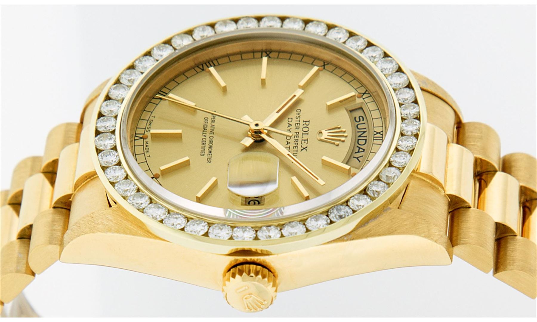 One Mens Rolex Day Date 18K Yellow Gold President Polished, Serviced & Electronically Tested, 18K Yellow Gold Case:36mm, 18K Yellow Gold Crown, Custom Bezel: 18K Yellow Gold Channel Set Diamond Bezel, Diamond Count: 40 Diamonds In Bezel. Total Weight 3.0 Carat, Clarity: SI-VS, Color: G to H. Custom Crystal: Synthetic Sapphire Cyclops Lens. Movement: Automatic Winding Movement Caliber 3055. Dial: Champagne Index With Square Roman Track. Date Window: 3 O'Clock Position Date Display, Day Window: 12 O'Clock Position Date Display. Quickset, Model: Day Date President. Condition: G-6 Extra Fine The Watch Is In Very Good Condition Free Of All Scratches And Dents. Bracelet: 18K Yellow Gold President. Bright Polish. 7.0 Inch Length, Standard Hidden President Clasp President Band, With Rolex Logo. Comes with 6 month warranty.