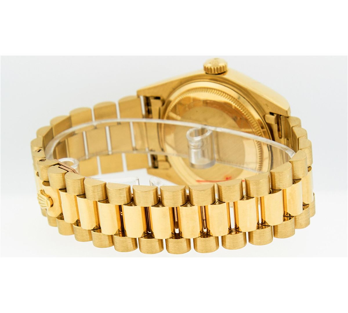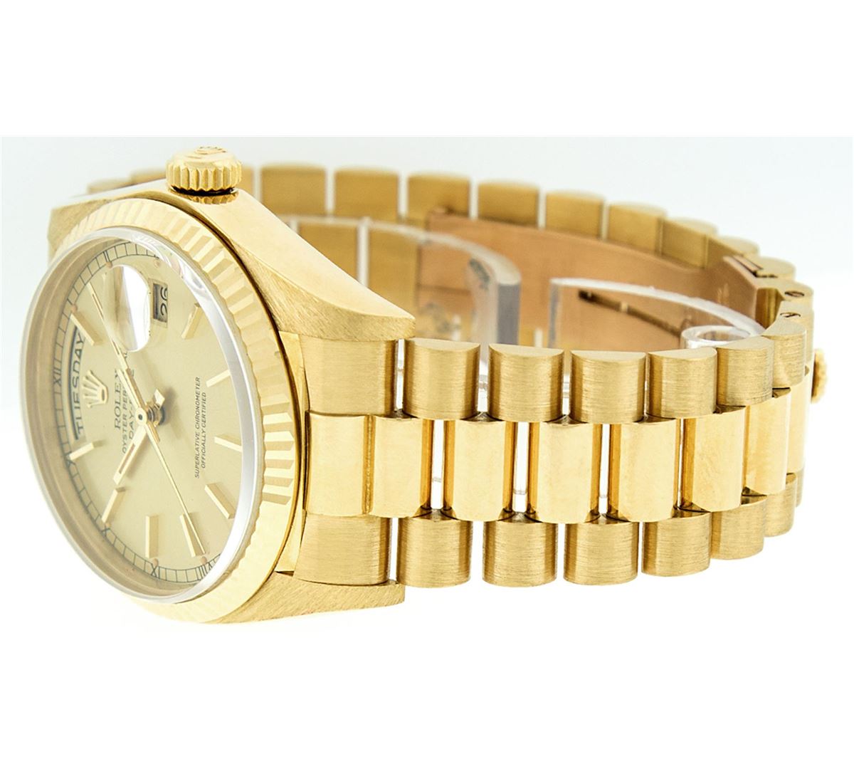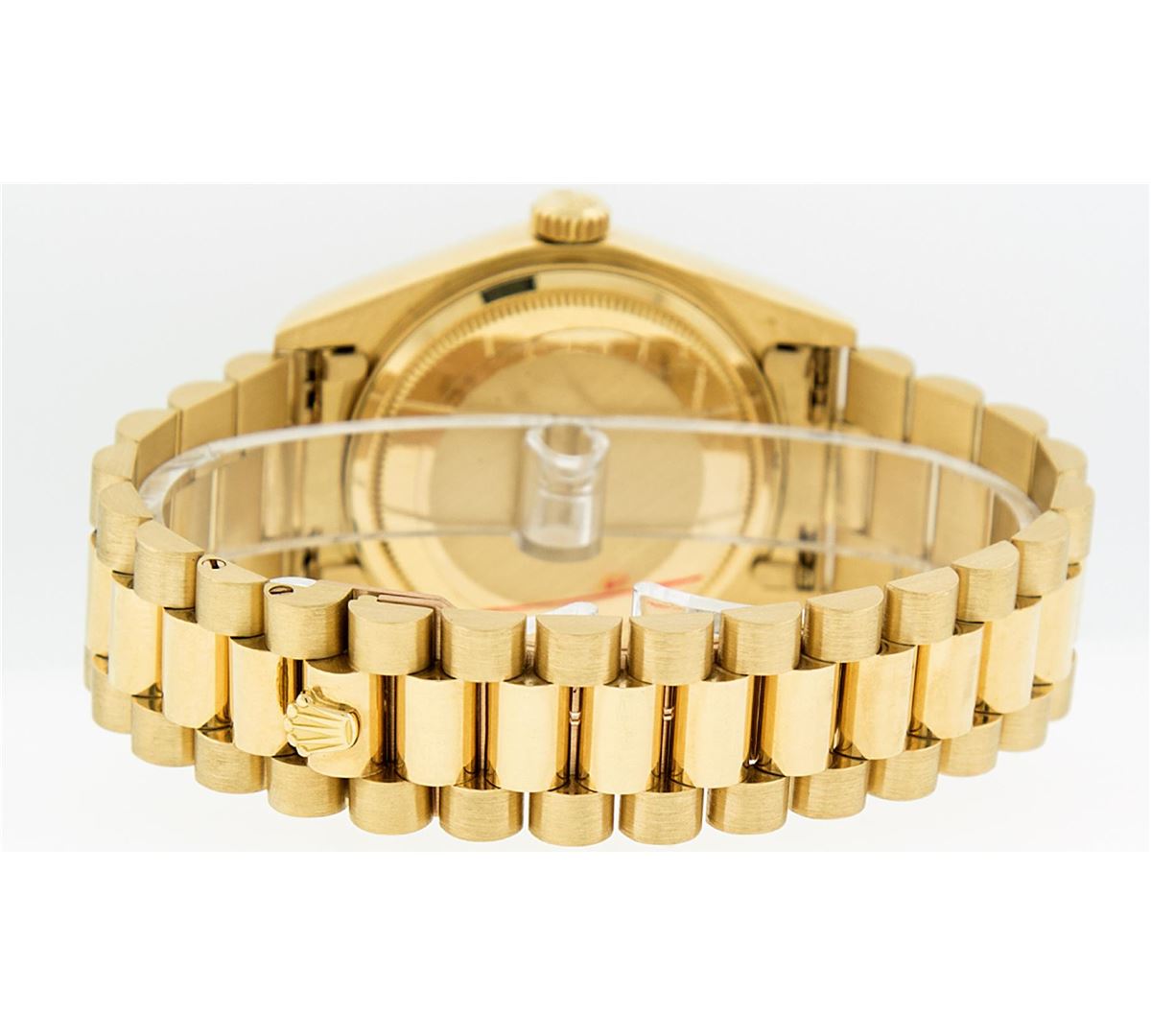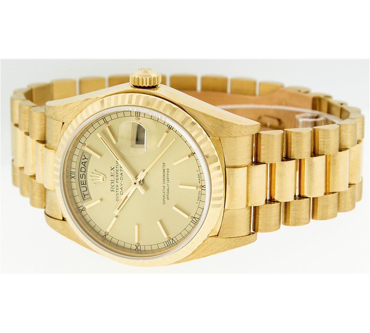 One Mens Rolex Day Date 18K Yellow Gold President Polished, Serviced & Electronically Tested, 18K Yellow Gold Case:36mm, 18K Yellow Gold Crown, Bezel: 18K Yellow Gold Fluted Bezel, Custom Crystal: Acrylic Cyclops Lens. Movement: Automatic Winding Movement Caliber 3055. Dial: Champagne With Index Hour Markers and Square Roman Track, Date Window: 3 O'Clock Position, Day Display: 12 O'Clock Position, Model: Day Date President, Single Quickset, Condition: G-6 Extra Fine. Bracelet: Yellow Gold President Hidden Clasp With Crown Logo. Bright Polish. 7.0 Inch Length
