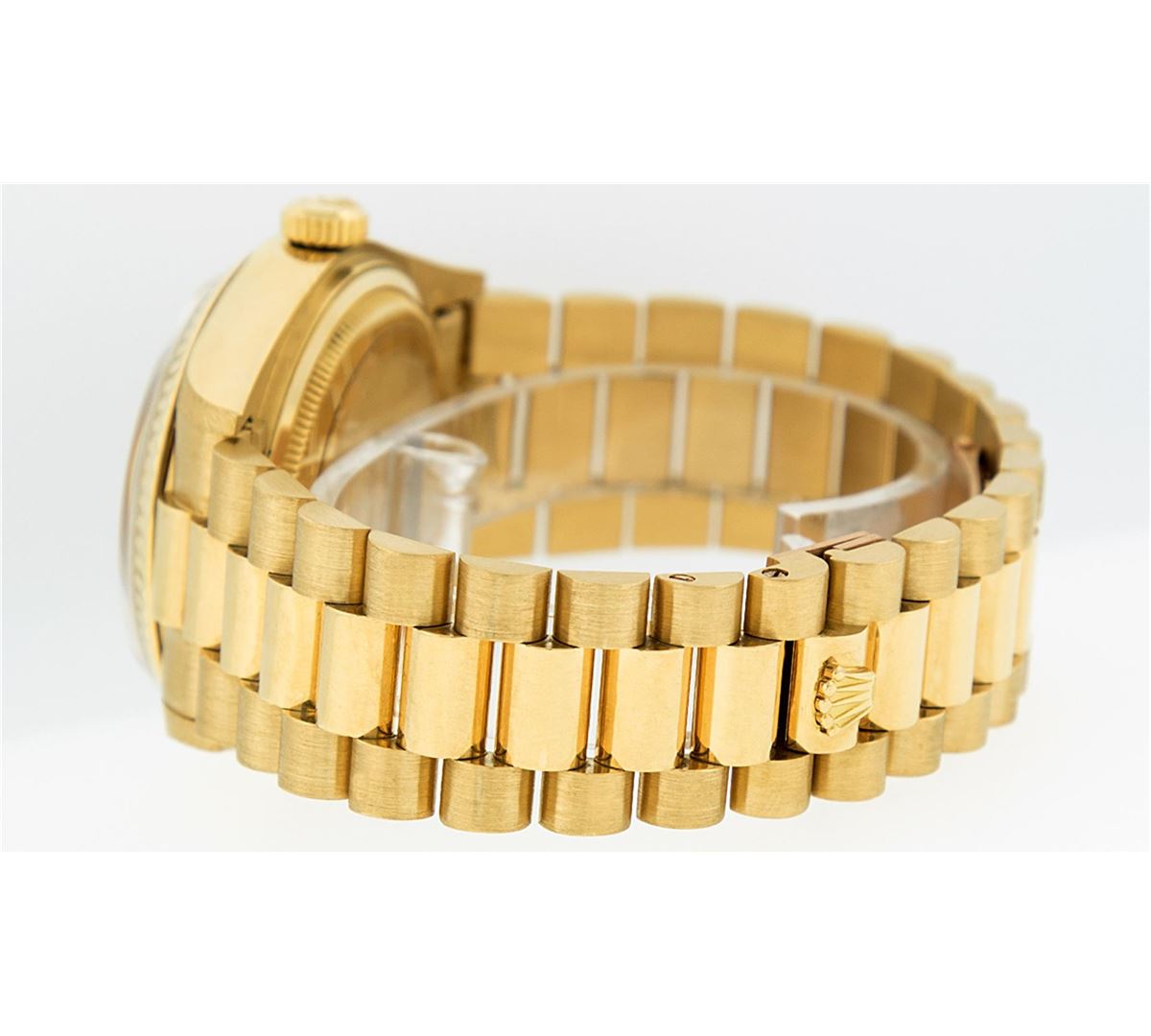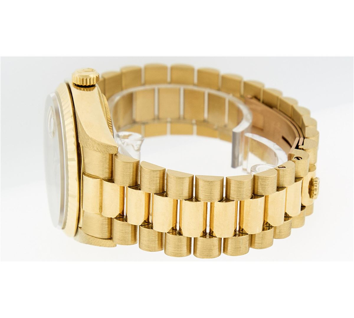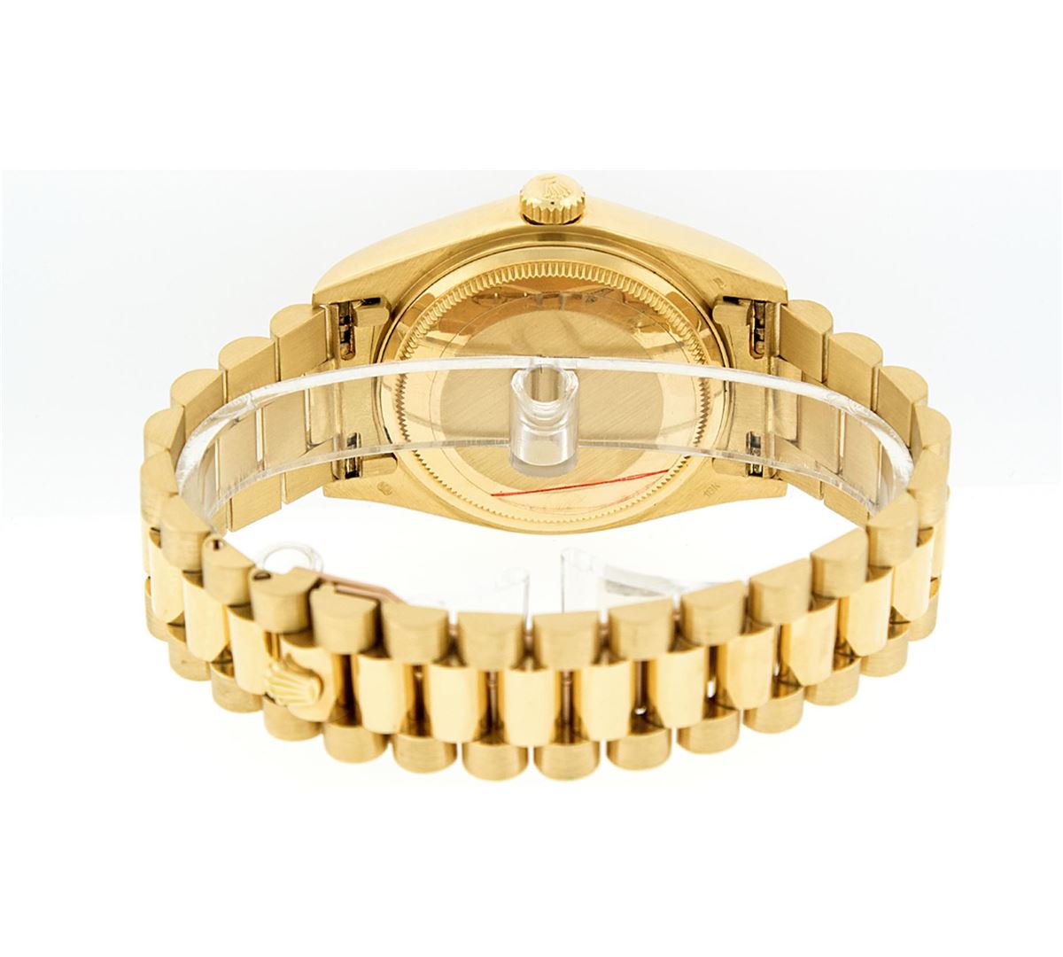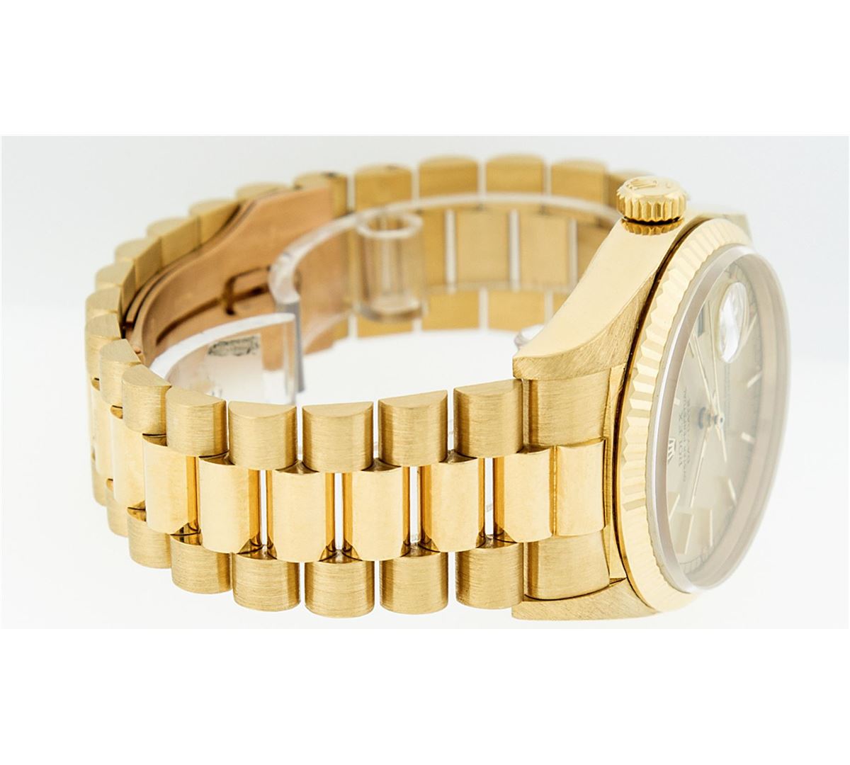 One Mens Rolex Day Date 18K Yellow Gold President Polished, Serviced & Electronically Tested, 18K Yellow Gold Case:36mm, 18K Yellow Gold Crown, Bezel: 18K Yellow Gold Fluted Bezel, Custom Crystal: Acrylic Cyclops Lens. Movement: Automatic Winding Movement Caliber 3055. Dial: Champagne With Index Hour Markers and Square Roman Track, Date Window: 3 O'Clock Position, Day Display: 12 O'Clock Position, Model: Day Date President, Single Quickset, Condition: G-6 Extra Fine. Bracelet: Yellow Gold President Hidden Clasp With Crown Logo. Bright Polish. 7.0 Inch Length