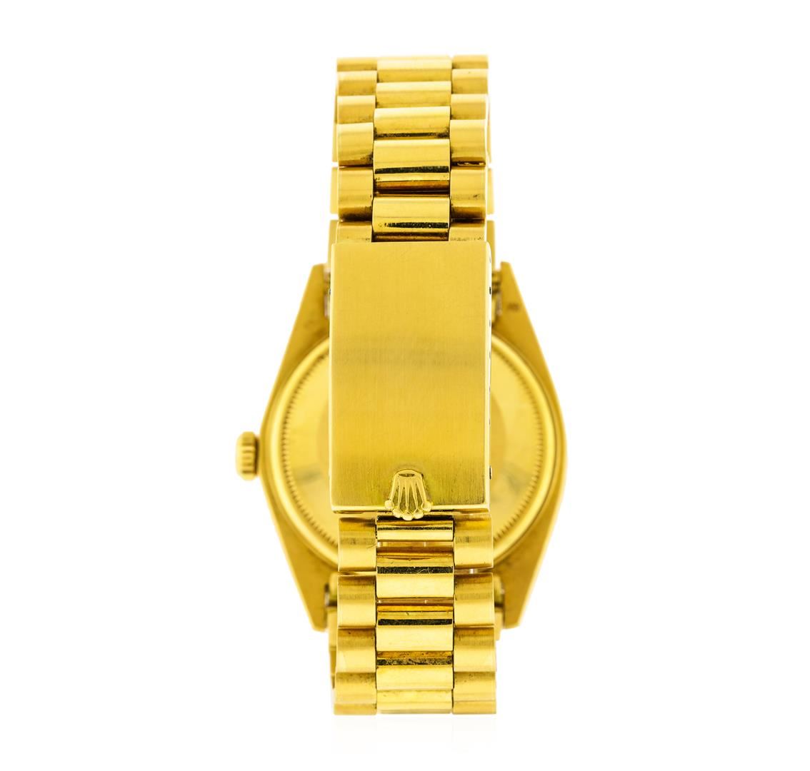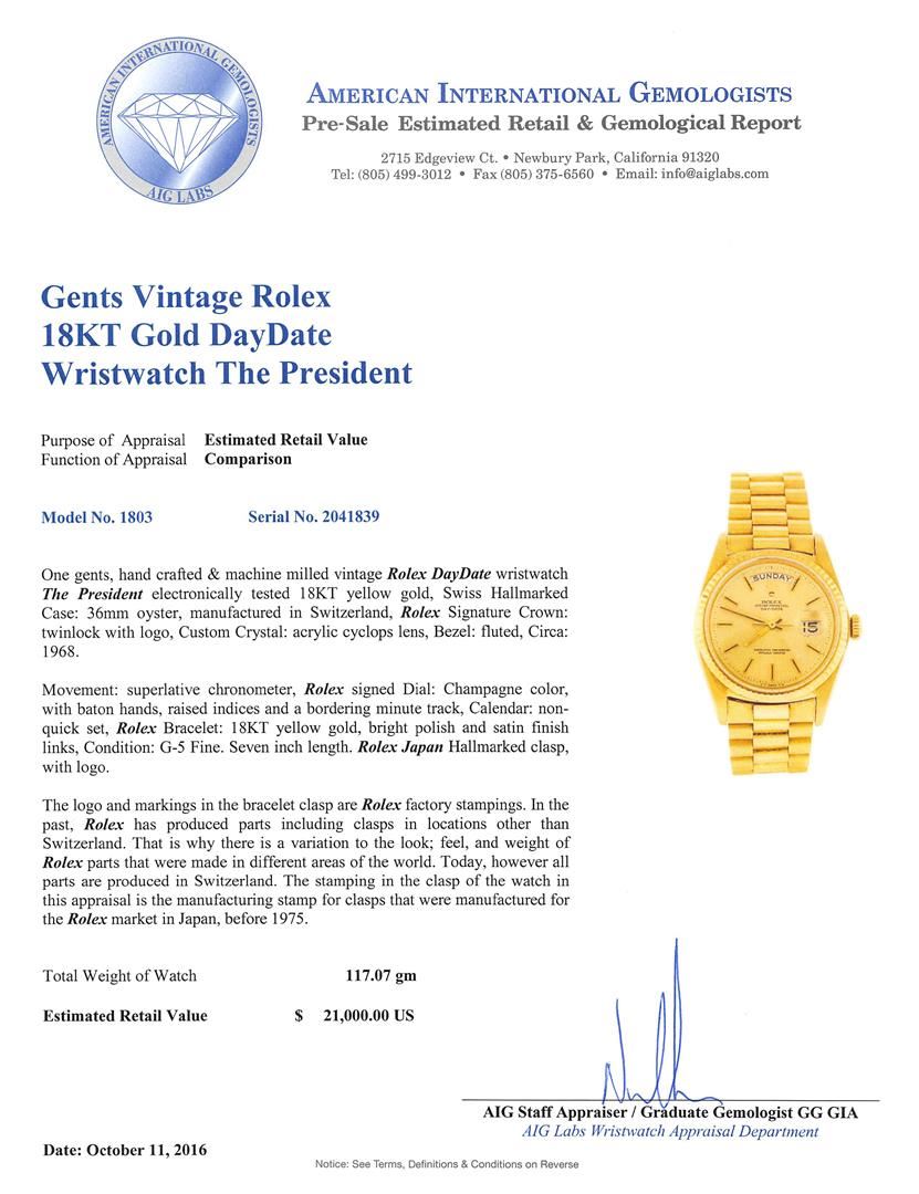 One gents, hand crafted & machine milled vintage Rolex DayDate wristwatch The President electronically tested 18KT yellow gold, Swiss Hallmarked Case: 36mm oyster, manufactured in Switzerland, Rolex Signature Crown: twinlock with logo, Custom Crystal: acrylic cyclops lens, Bezel: fluted, Circa: 1968.Movement: superlative chronometer, Rolex signed Dial: Champagne color, with baton hands, raised indices and a bordering minute track, Calendar: non-quick set, Rolex Bracelet: 18KT yellow gold, bright polish and satin finish links, Condition: G-5 Fine. Seven inch length. Rolex Japan Hallmarked clasp, with logo. The logo and markings in the bracelet clasp are Rolex factory stampings. In the past, Rolex has produced parts including clasps in locations other than Switzerland. That is why there is a variation to the look; feel, and weight of Rolex parts that were made in different areas of the world. Today, however all parts are produced in Switzerland. The stamping in the clasp of the watch in this appraisal is the manufacturing stamp for clasps that were manufactured for the Rolex market in Japan, before 1975.Total Weight of Watch 117.07gm. AIG Appraised at $21,000.00.