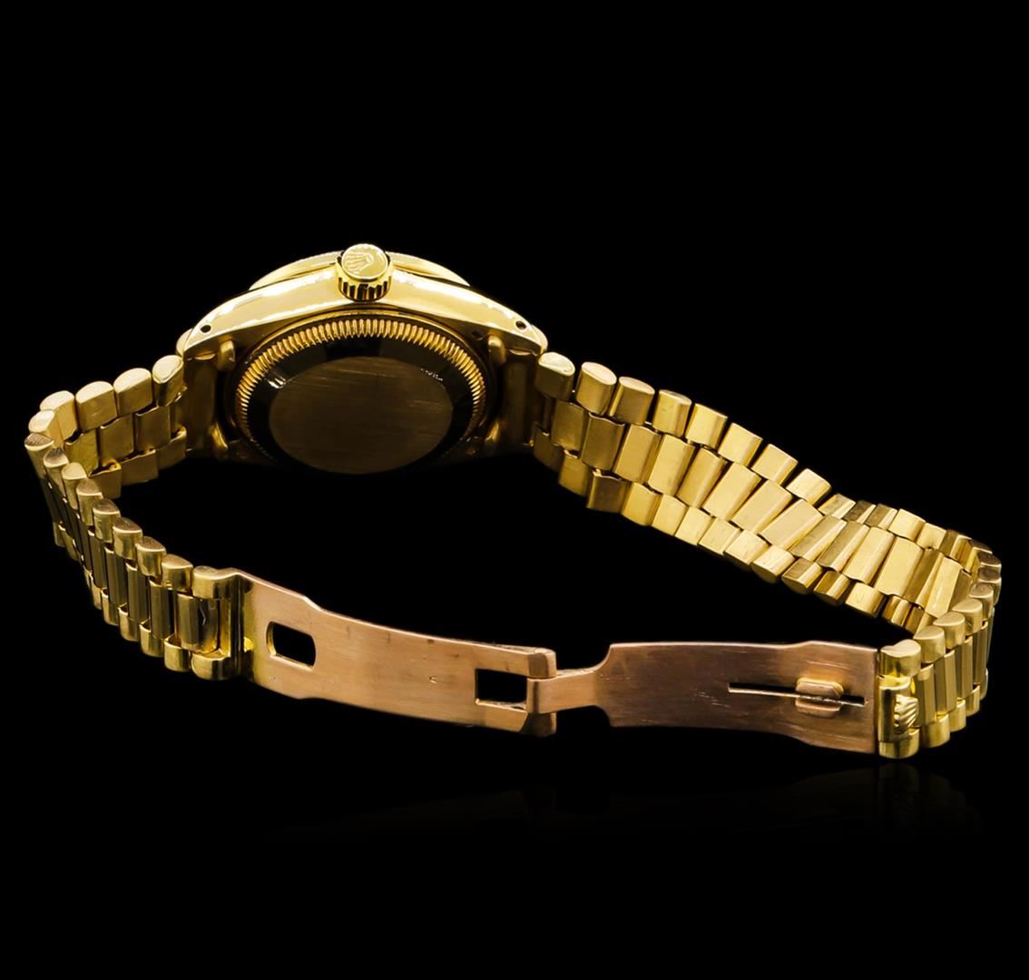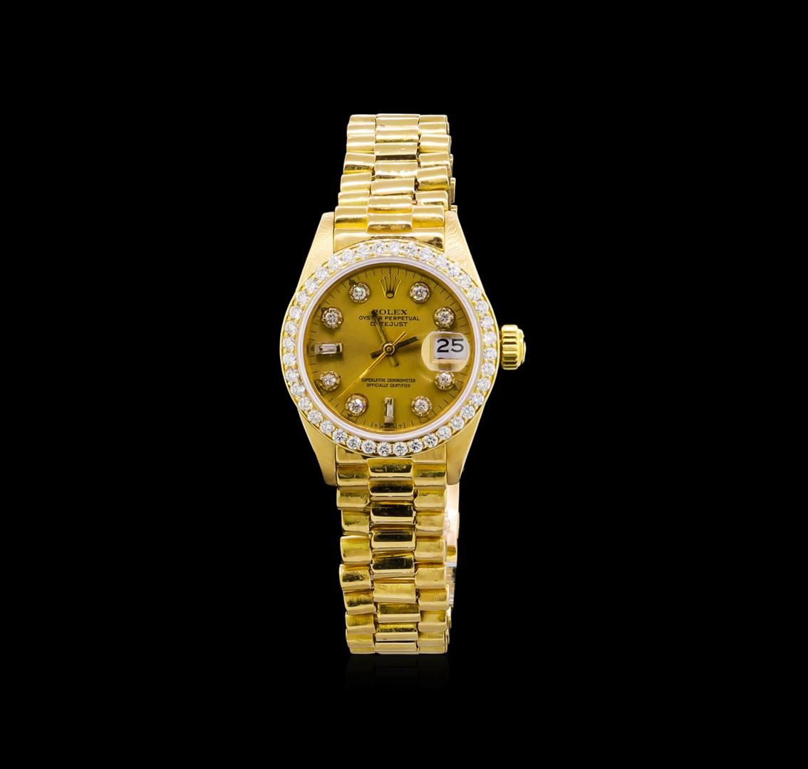 One ladies, hand crafted & machine milled Rolex Lady President the DateJust model wristwatch electronically tested 18KT yellow gold, Circa: 1980, Swiss Hallmarked Case: 26mm oyster, Crown: twinlock with logo, Custom Bezel: diamond set, Custom Crystal: synthetic sapphire cyclops lens. Movement: superlative chronometer, Customized Dial: Champagne color, baton hands, & diamond markers, Date Display: Ivory color, 3 o'clock position, non-quick set, Bracelet: 18KT yellow gold Lady President, Condition: G-5 Fine. Bright polish & satin finish. Six and one half inch length. Swiss and Rolex Hallmarked concealed deployment clasp, with logo. Containing: Forty prong set round brilliant cut diamonds, measuring an average of 1.80mm in diameter, approximate total weight = 0.80ct Set & graded in the custom bezel. Clarity VS-1 Average. Color: G - H. Total Weight of Diamonds 0.80ct. Total Weight of Watch 68.47gm. AIG Appraised at $19,000.00.