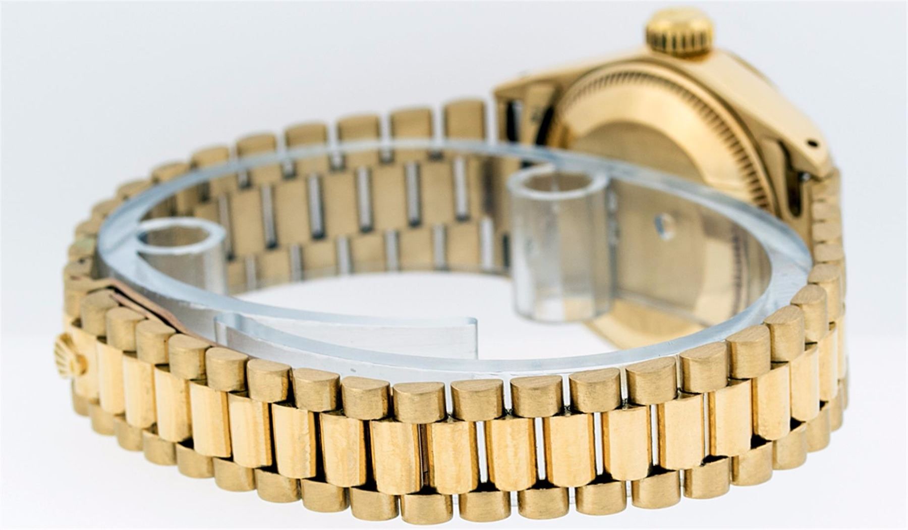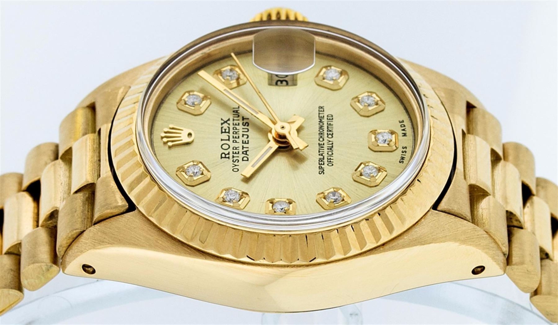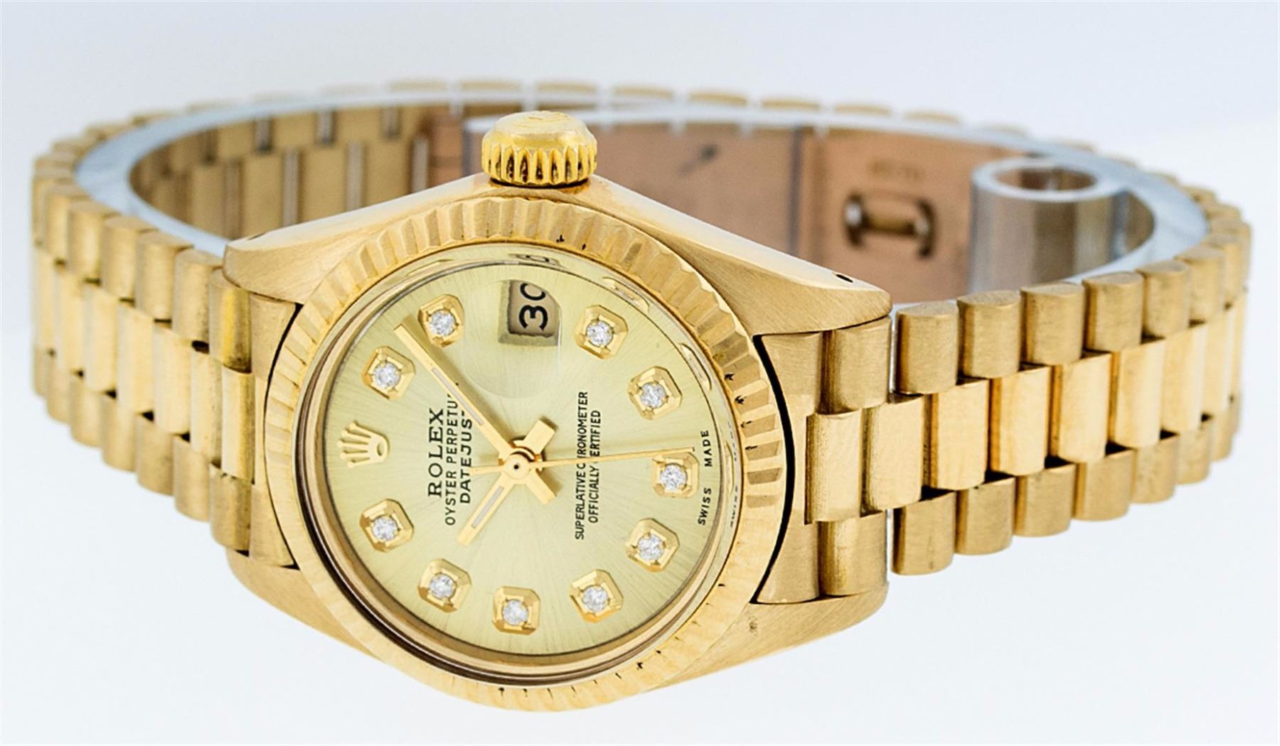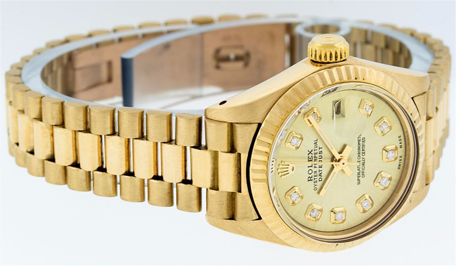 One Ladies Rolex 18K Yellow Gold President Polished, Serviced & Electronically Tested, 18K Yellow Gold Case: 26mm, 18K Yellow Gold Crown, Bezel: 18K Yellow Gold Fluted Bezel. Custom Crystal: Acrylic Cyclops Lens. Movement: Automatic Winding Movement Caliber 2030. Custom Dial: Champagne Diamond Dial, Color: G to H, Diamond Count: 10 Diamonds In Dial, Clarity: SI-VS. Date Window: 3 O'Clock Position, Model: Datejust. Condition: G-6 Extra Fine The Watch Is In Very Good Condition Free Of All Scratches And Dents. . Bracelet: 18K Yellow Gold President Band, Bright & Satin Polish. 6.0 Inch Length, Standard President Clasp (Hidden Clasp), With Rolex Logo.