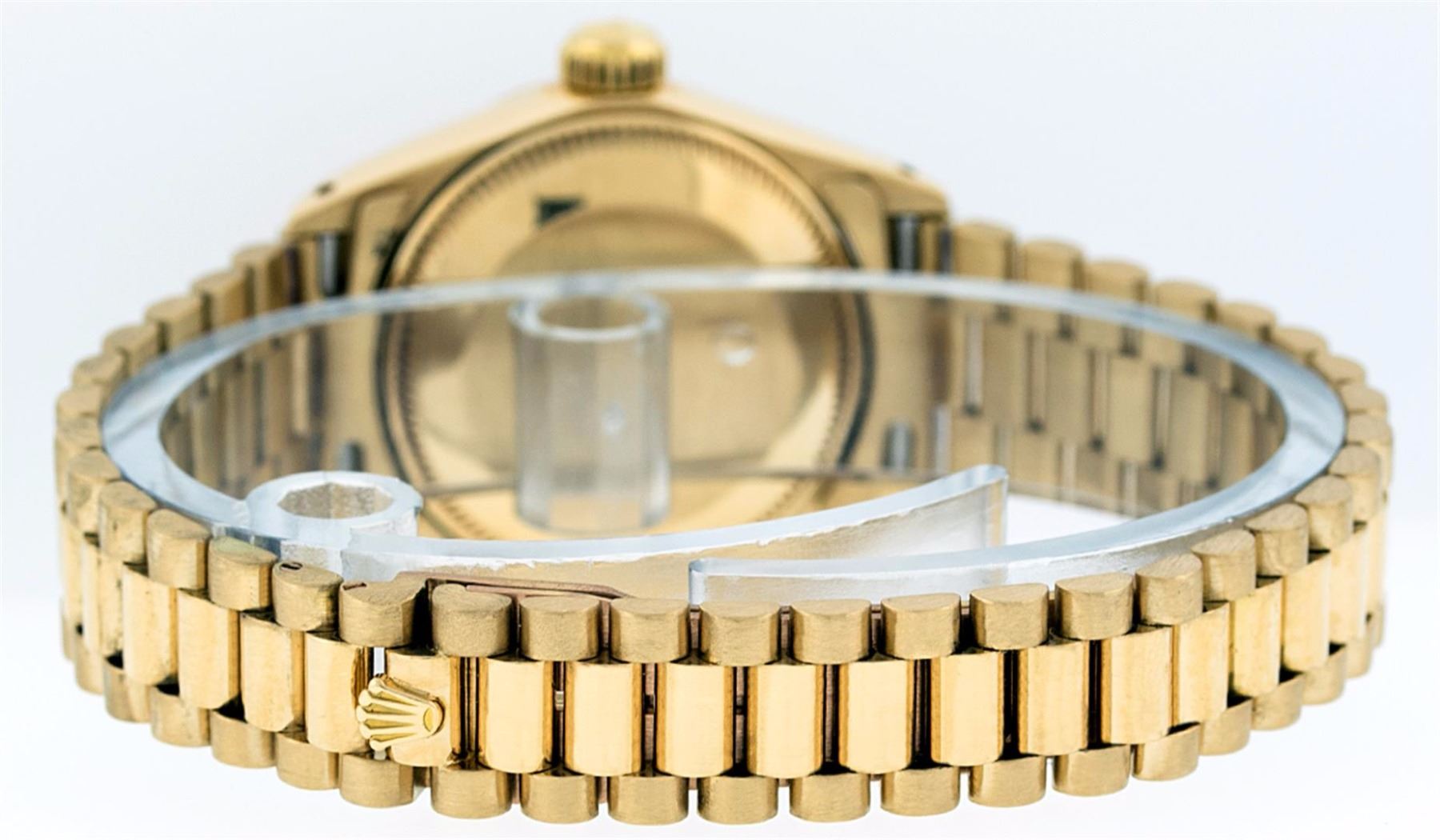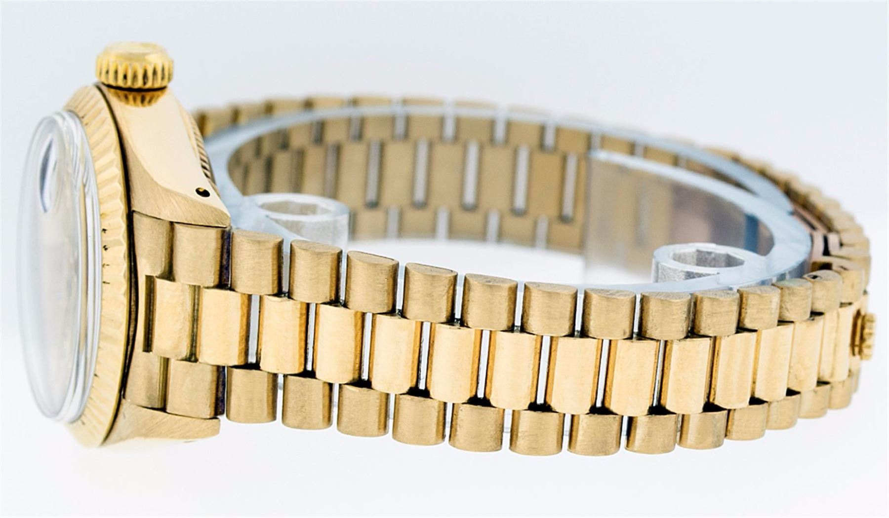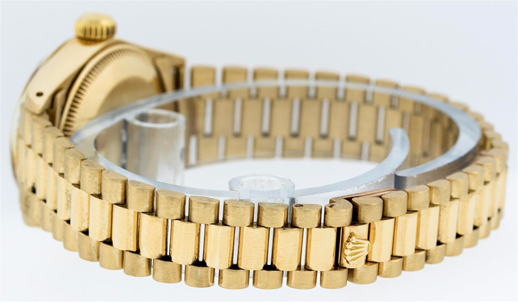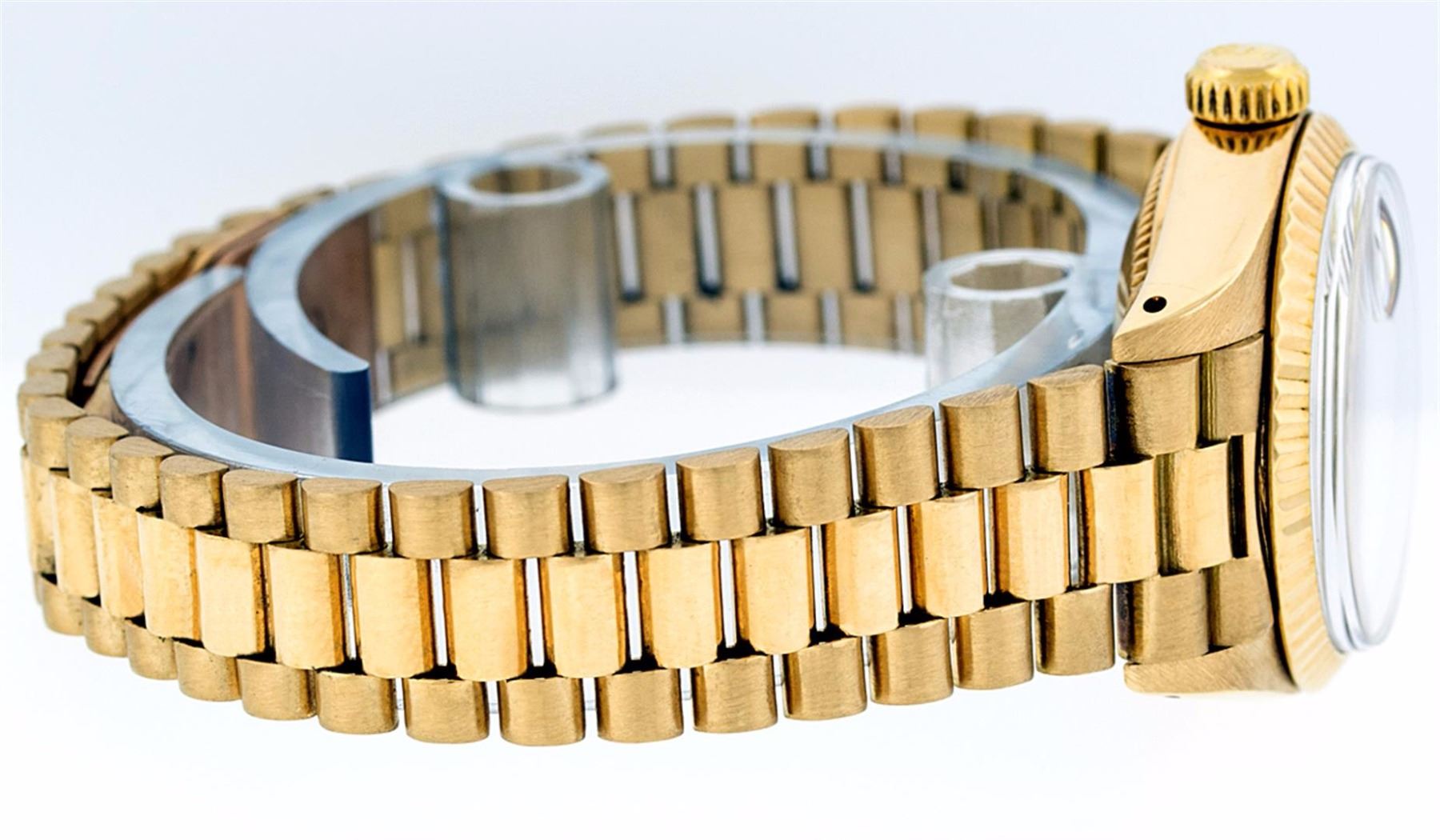One Ladies Rolex 18K Yellow Gold President Polished, Serviced & Electronically Tested, 18K Yellow Gold Case: 26mm, 18K Yellow Gold Crown, Bezel: 18K Yellow Gold Fluted Bezel. Custom Crystal: Acrylic Cyclops Lens. Movement: Automatic Winding Movement Caliber 2030. Custom Dial: Champagne Diamond Dial, Color: G to H, Diamond Count: 10 Diamonds In Dial, Clarity: SI-VS. Date Window: 3 O'Clock Position, Model: Datejust. Condition: G-6 Extra Fine The Watch Is In Very Good Condition Free Of All Scratches And Dents. . Bracelet: 18K Yellow Gold President Band, Bright & Satin Polish. 6.0 Inch Length, Standard President Clasp (Hidden Clasp), With Rolex Logo.