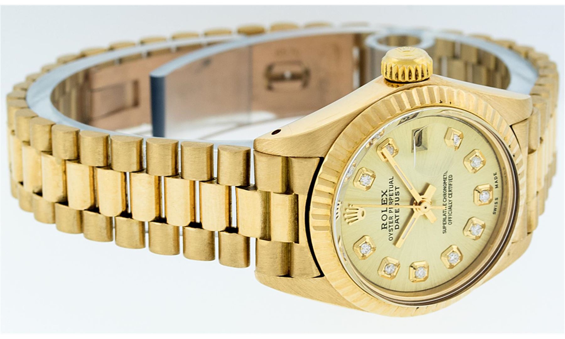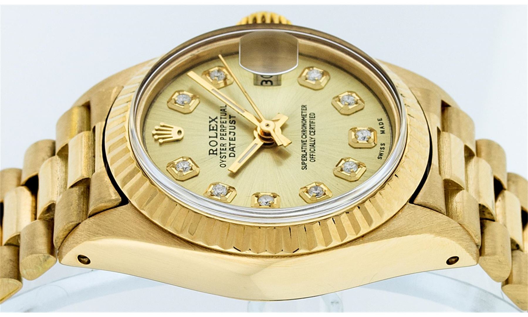 One Ladies Rolex 18K Yellow Gold President Polished, Serviced & Electronically Tested, 18K Yellow Gold Case: 26mm, 18K Yellow Gold Crown, Bezel: 18K Yellow Gold Fluted Bezel. Custom Crystal: Acrylic Cyclops Lens. Movement: Automatic Winding Movement Caliber 2030. Custom Dial: Champagne Diamond Dial, Color: G to H, Diamond Count: 10 Diamonds In Dial, Clarity: SI-VS. Date Window: 3 O'Clock Position, Model: Datejust. Condition: G-6 Extra Fine The Watch Is In Very Good Condition Free Of All Scratches And Dents. . Bracelet: 18K Yellow Gold President Band, Bright & Satin Polish. 6.0 Inch Length, Standard President Clasp (Hidden Clasp), With Rolex Logo.