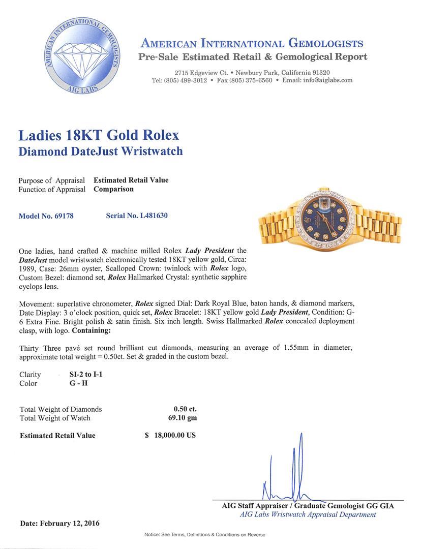 One ladies, hand crafted & machine milled Rolex Lady President the DateJust model wristwatch electronically tested 18KT yellow gold, Circa: 1989, Case: 26mm oyster, Scalloped Crown: twinlock with Rolex logo, Custom Bezel: diamond set, Rolex Hallmarked Crystal: synthetic sapphire cyclops lens. Movement: superlative chronometer, Rolex signed Dial: Dark Royal Blue, baton hands, & diamond markers, Date Display: 3 o'clock position, quick set, Rolex Bracelet: 18KT yellow gold Lady President, Condition: G-6 Extra Fine. Bright polish & satin finish. Six inch length. Swiss Hallmarked Rolex concealed deployment clasp, with logo. Containing: Thirty Three pave, set round brilliant cut diamonds, measuring an average of 1.55mm in diameter, approximate total weight = 0.50ct. Set & graded in the custom bezel. Clarity SI-2 to I-1. Color: G - H. Total Weight of Diamonds 0.50ct. Total Weight of Watch 69.10gm. AIG Appraised at $18,000.00.