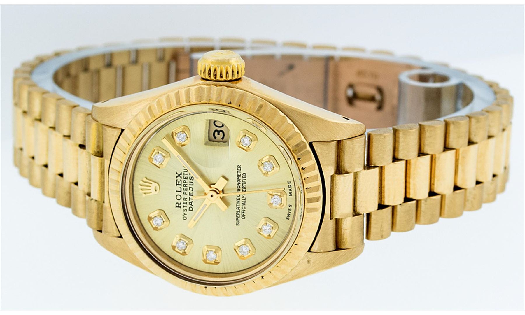 One Ladies Rolex 18K Yellow Gold President Polished, Serviced & Electronically Tested, 18K Yellow Gold Case: 26mm, 18K Yellow Gold Crown, Bezel: 18K Yellow Gold Fluted Bezel. Custom Crystal: Acrylic Cyclops Lens. Movement: Automatic Winding Movement Caliber 2030. Custom Dial: Champagne Diamond Dial, Color: G to H, Diamond Count: 10 Diamonds In Dial, Clarity: SI-VS. Date Window: 3 O'Clock Position, Model: Datejust. Condition: G-6 Extra Fine The Watch Is In Very Good Condition Free Of All Scratches And Dents. . Bracelet: 18K Yellow Gold President Band, Bright & Satin Polish. 6.0 Inch Length, Standard President Clasp (Hidden Clasp), With Rolex Logo.